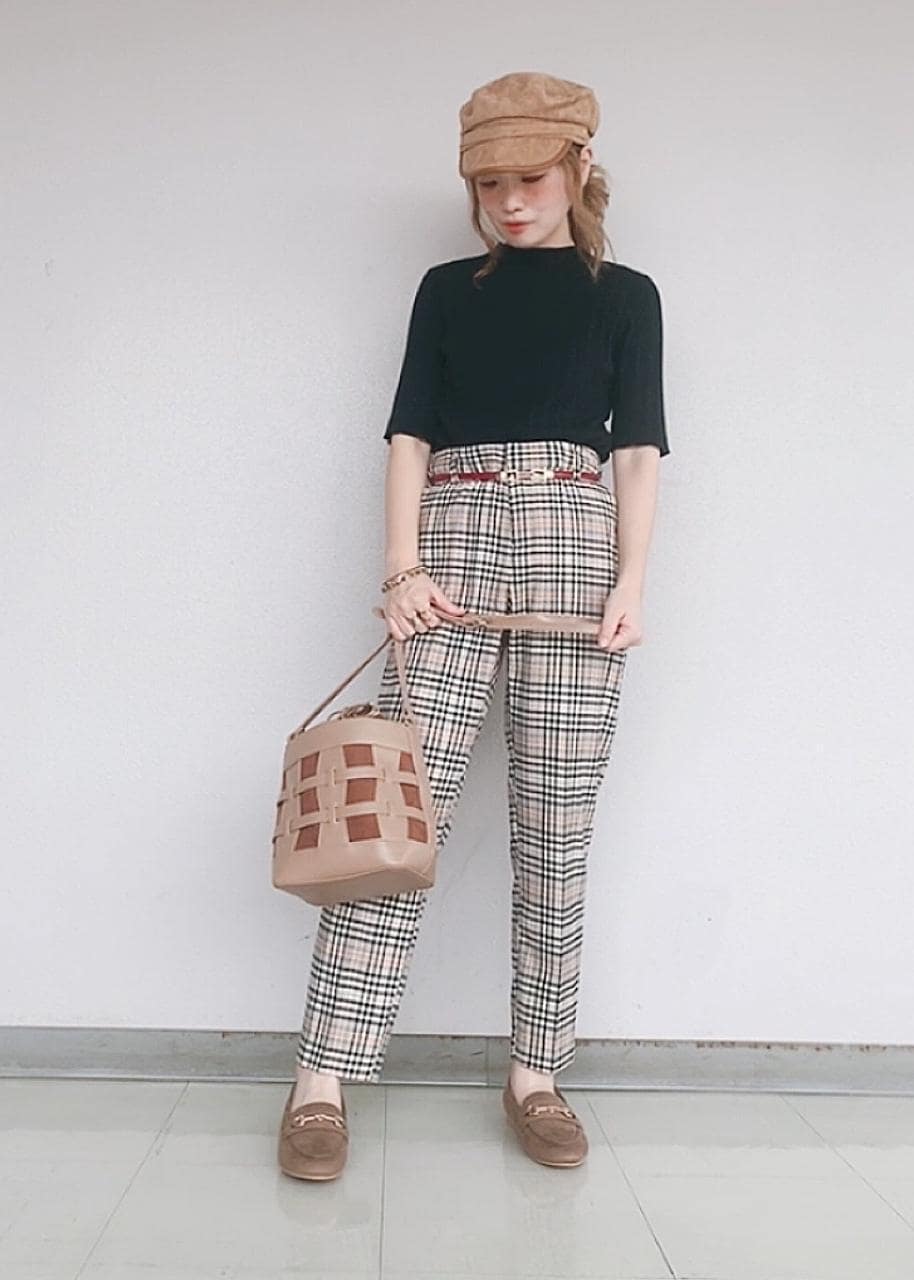 チュニックパンツ×黒のカットソーに秋らしいキャスケットを、合わせたキレイめカジュアルコーデ。チェック柄が目を引くテーパードパンツはとても動きやすく、薄手なので、今から秋まで使えるアイテム。