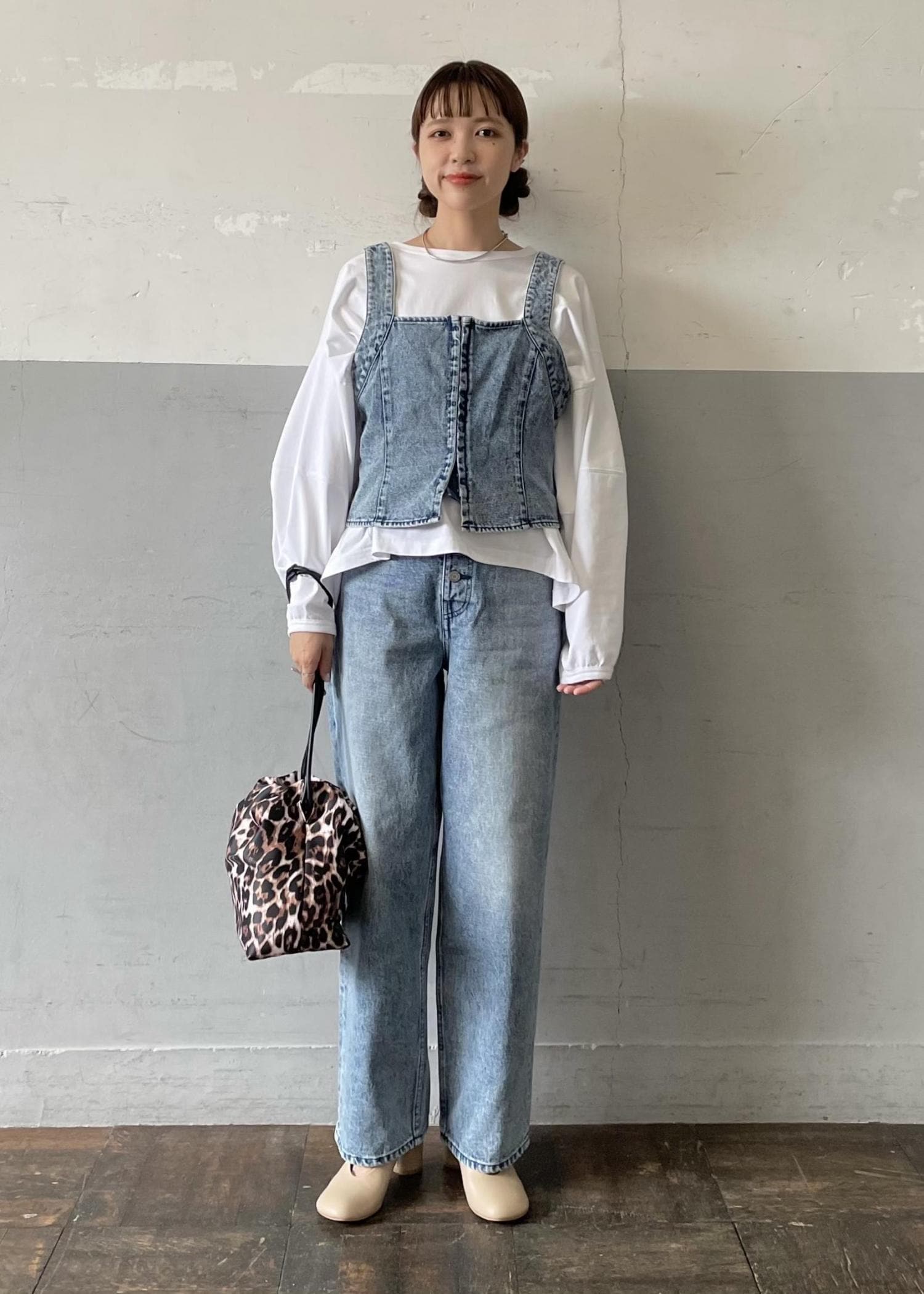 いま、デニムを新調するならサスティナブル(サステナブル)にこだわりたい。ビスチェとのセットアップが新鮮な、トレンド感あるデニムパンツコーデ