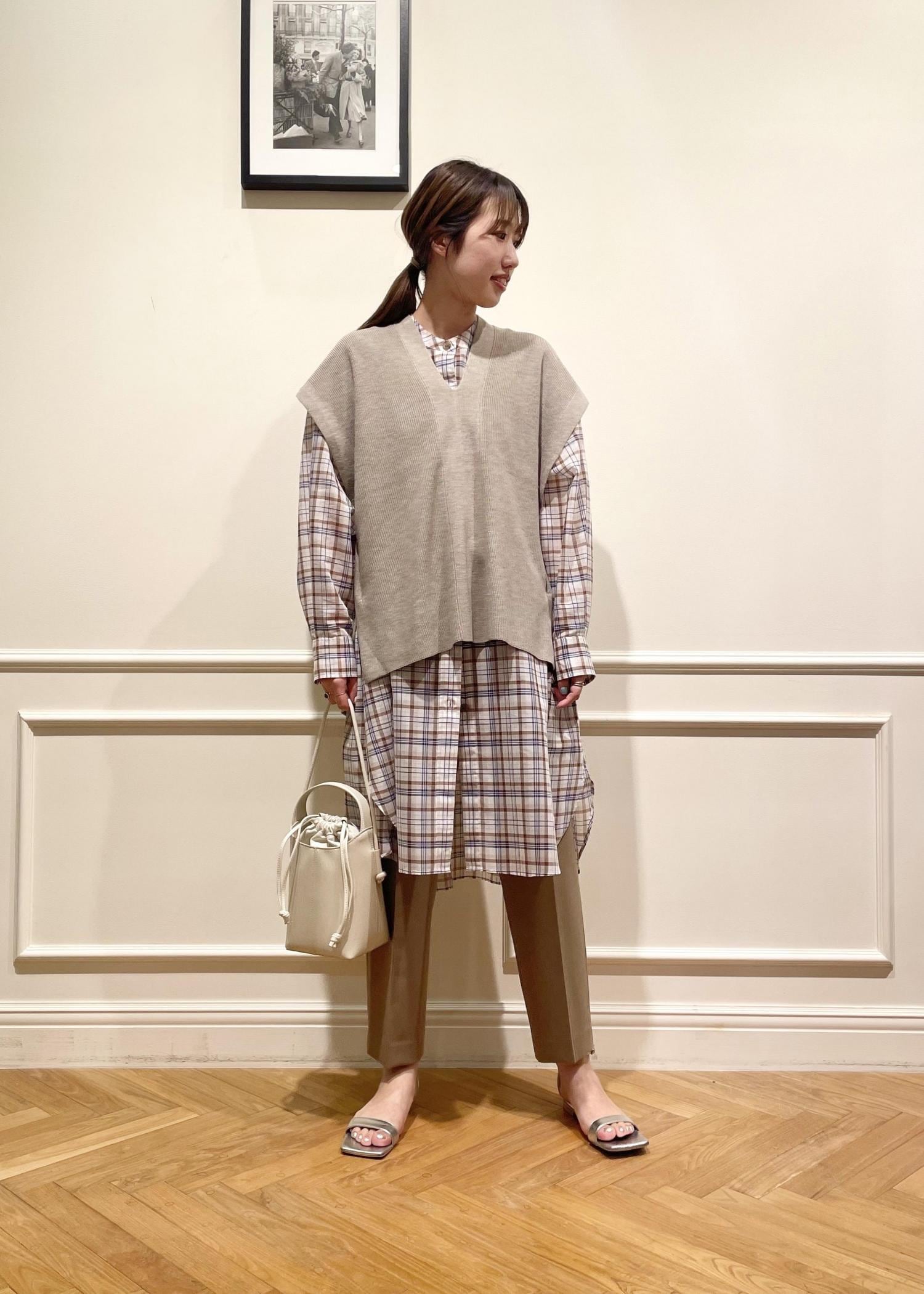 着るだけで旬スタイル完成!ニットベスト×ブラウスのドッキングトップス。カジュアルにもキレイ目にも着こなせる万能ニットスタイリング。