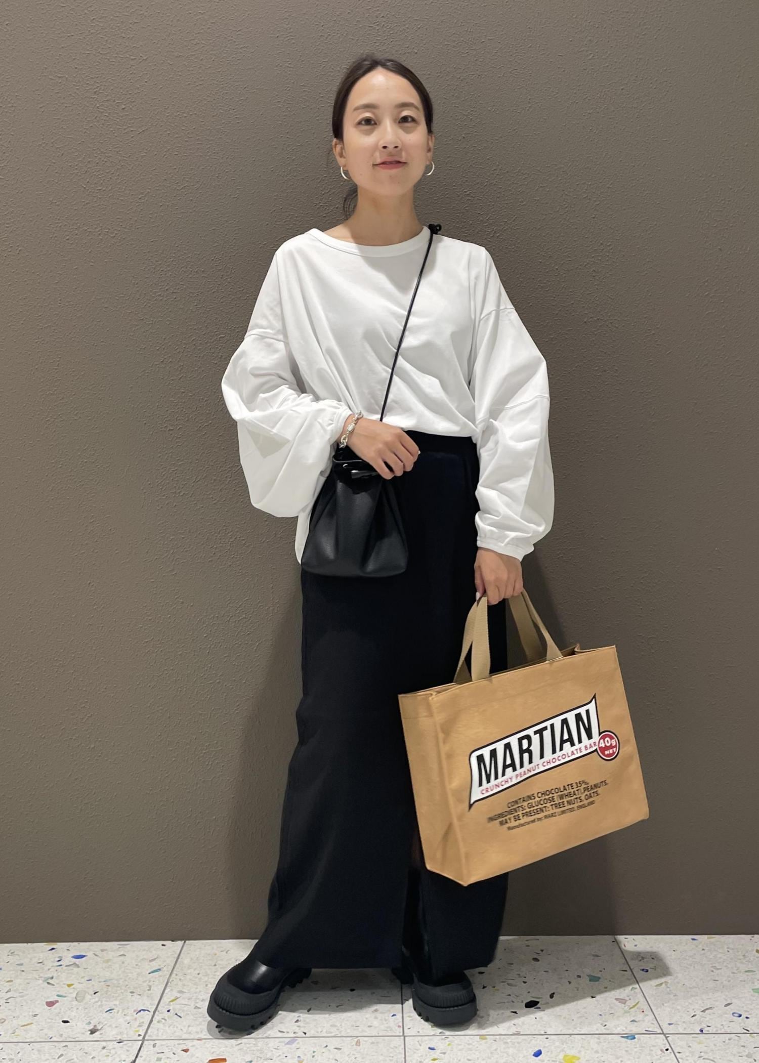 ブーディとバッグはブラックで引き締めて、落ち着いたコーディネイトに。