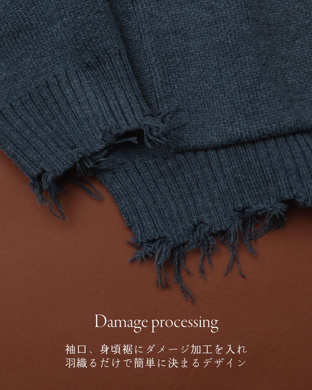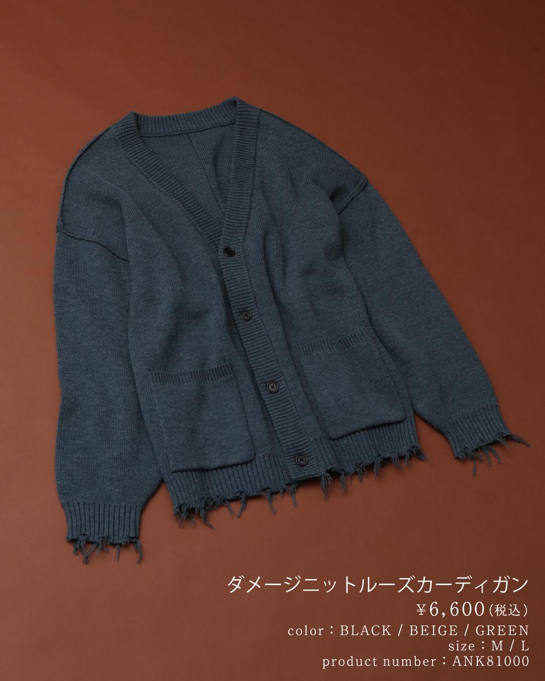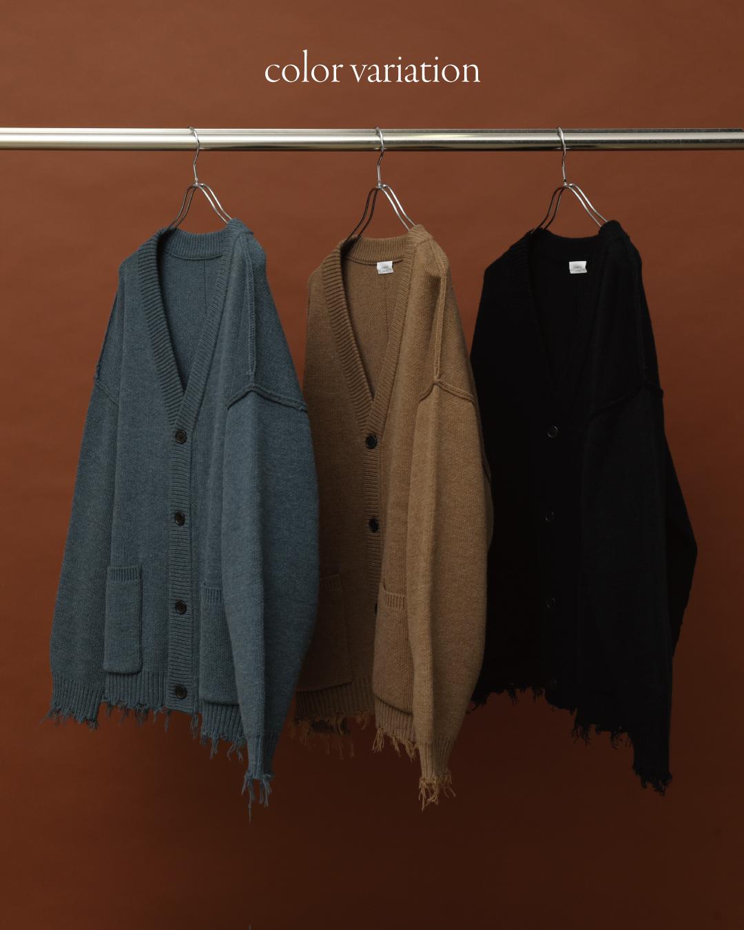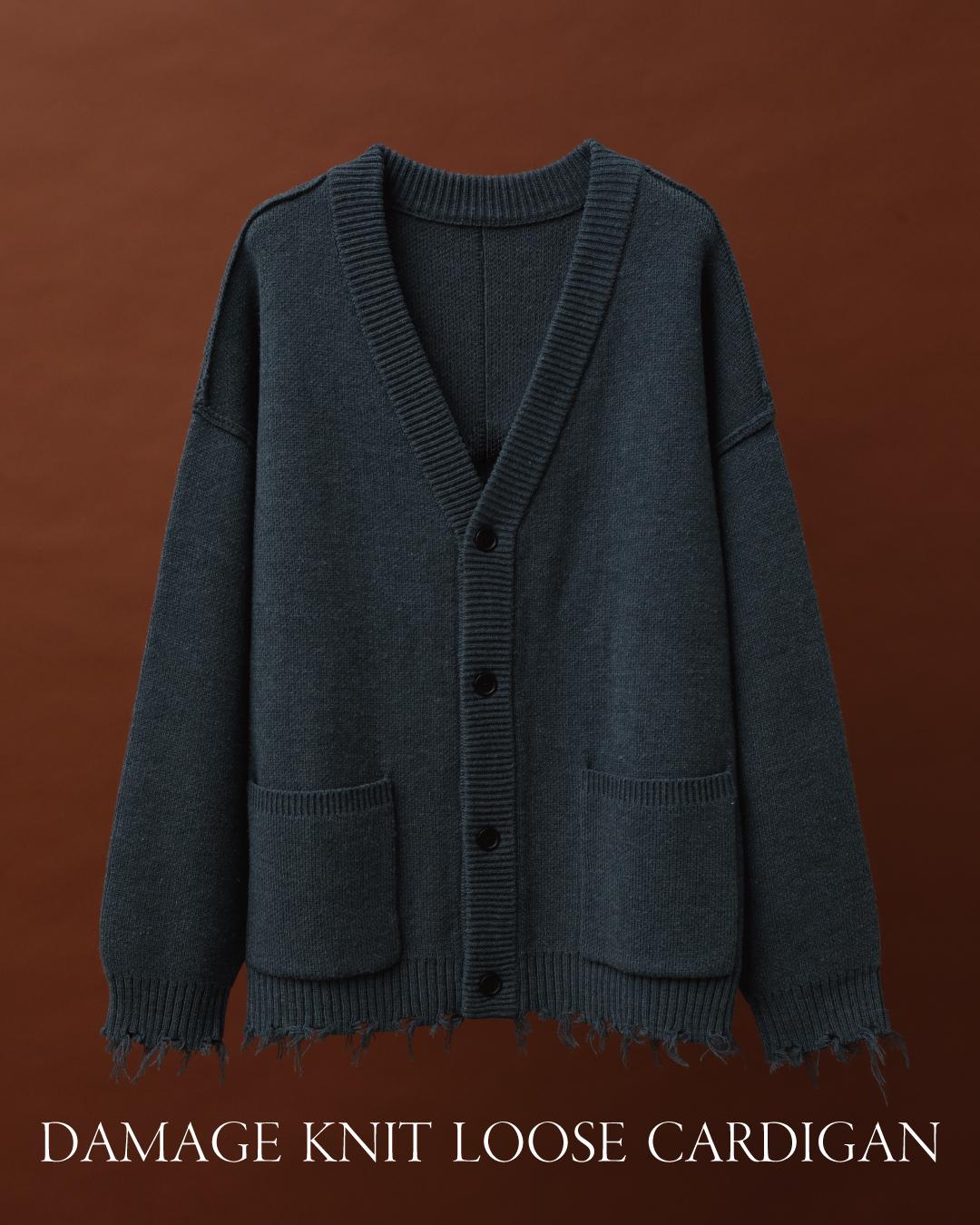 ダメージ加工を施したデザイン性抜群のカーディガンと、ベーシックでシンプルなビッグカーディガンの2種類から選べます。