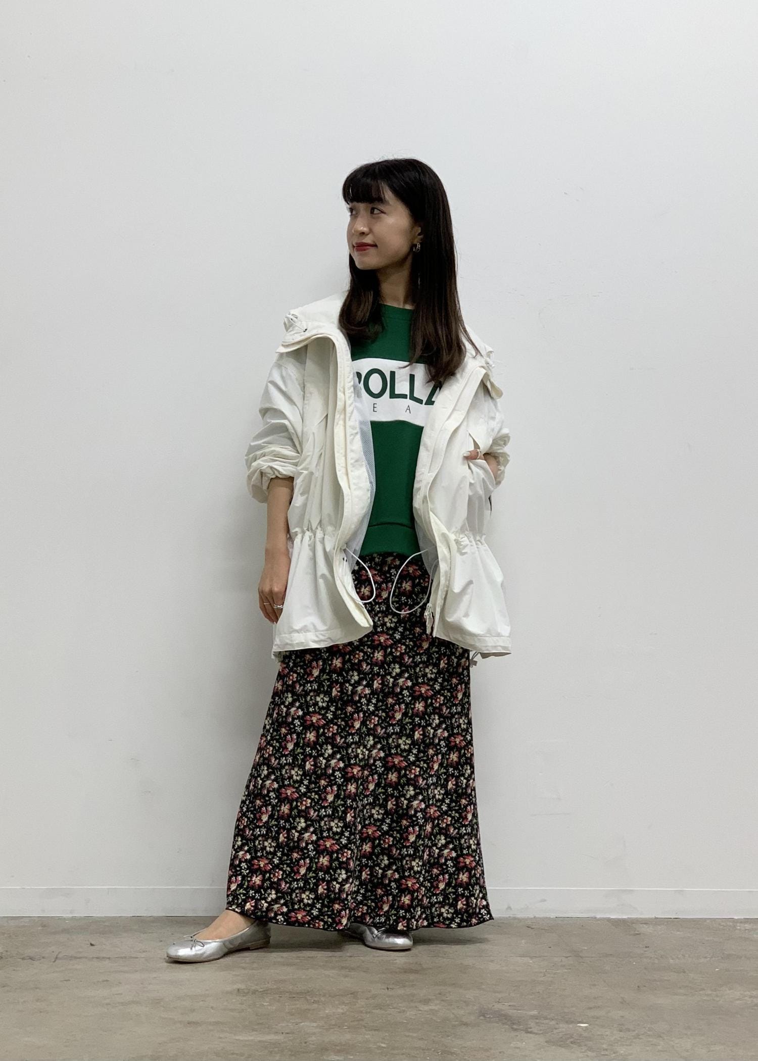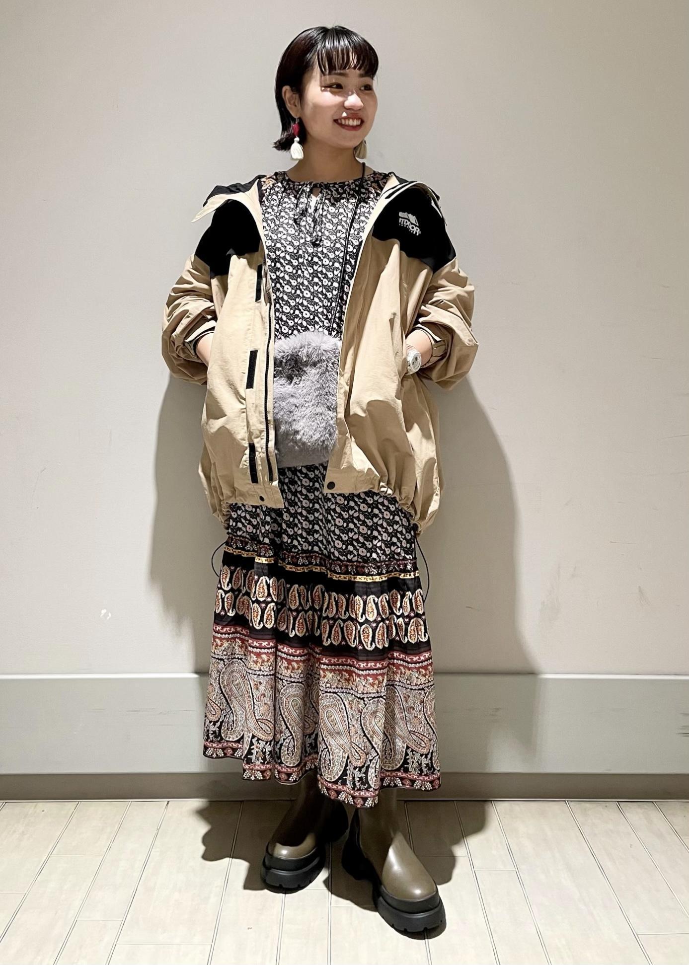 エアリー感のあるティアードレトロフラワースカートはオーバーサイズのマウンテンパーカーでアウトドア要素をMIXすると大人カジュアルなスタイリングが完成。
