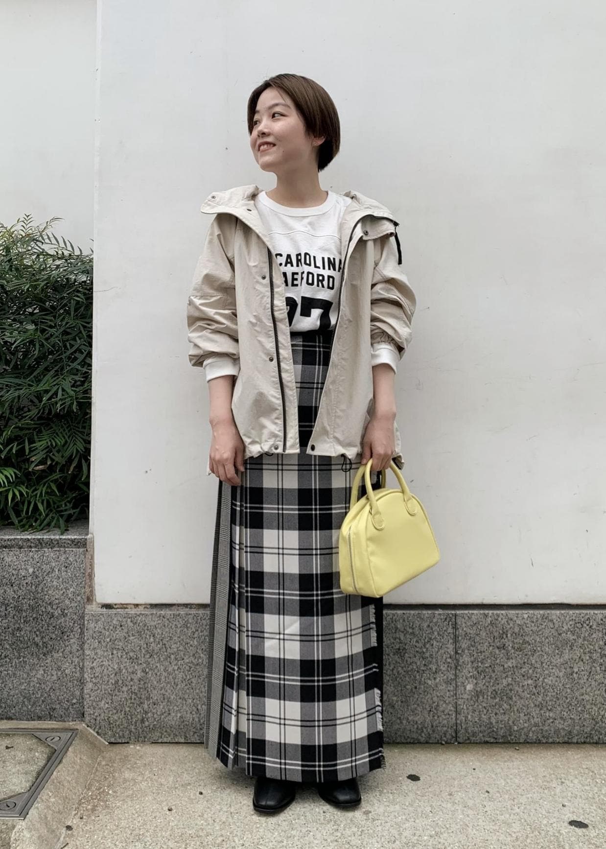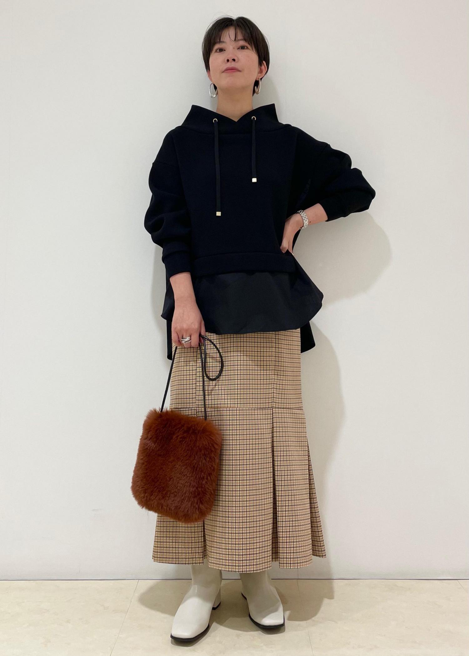マーメイドラインのチェックスカートに、デザイントップスを合わせ、ラフさはありつつも女性らしいスタイリングに。