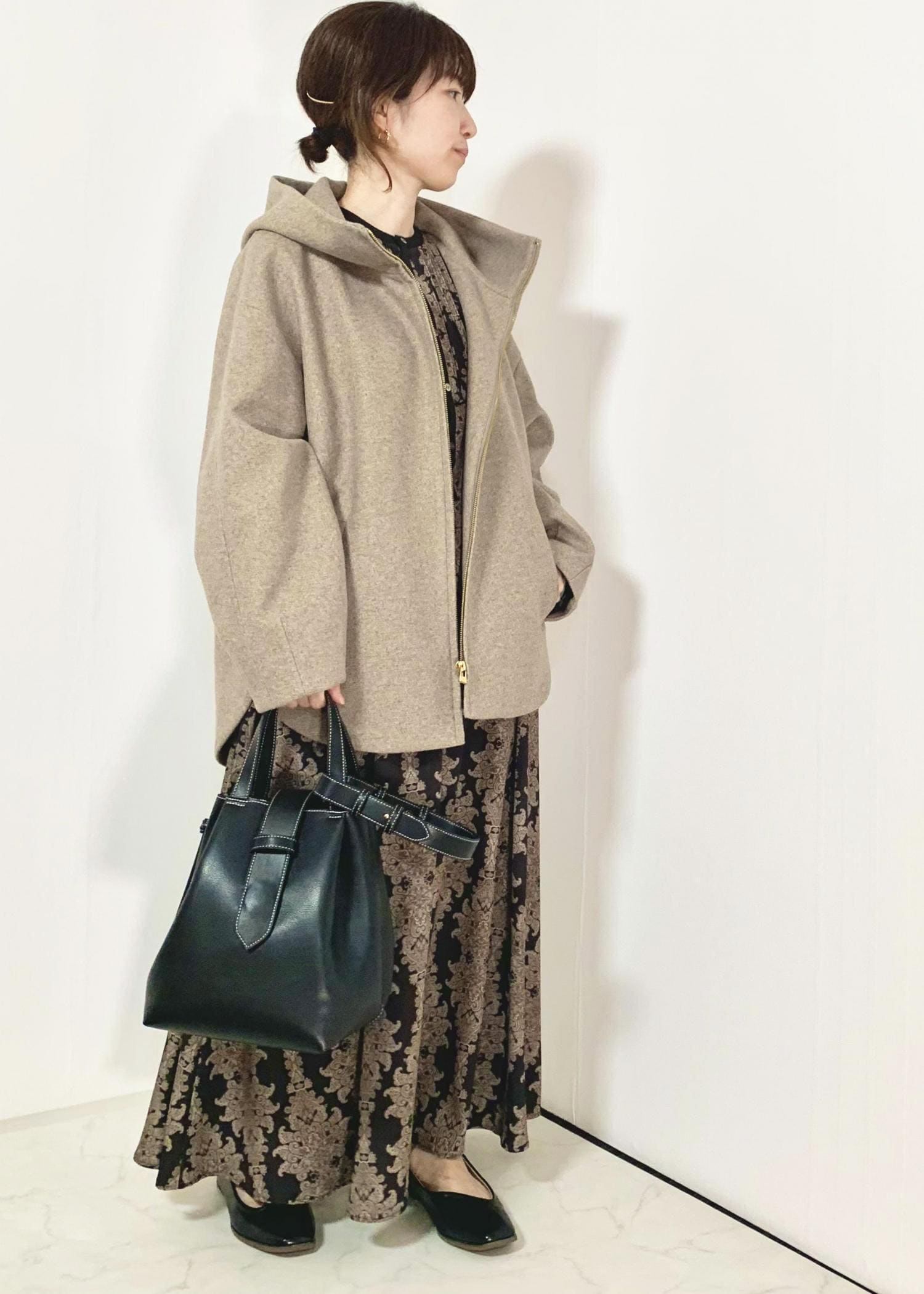 レトロなプリントワンピースにメルトンジャケットを羽織って、ブラウン×ブラックのシックなカラーコーデに。