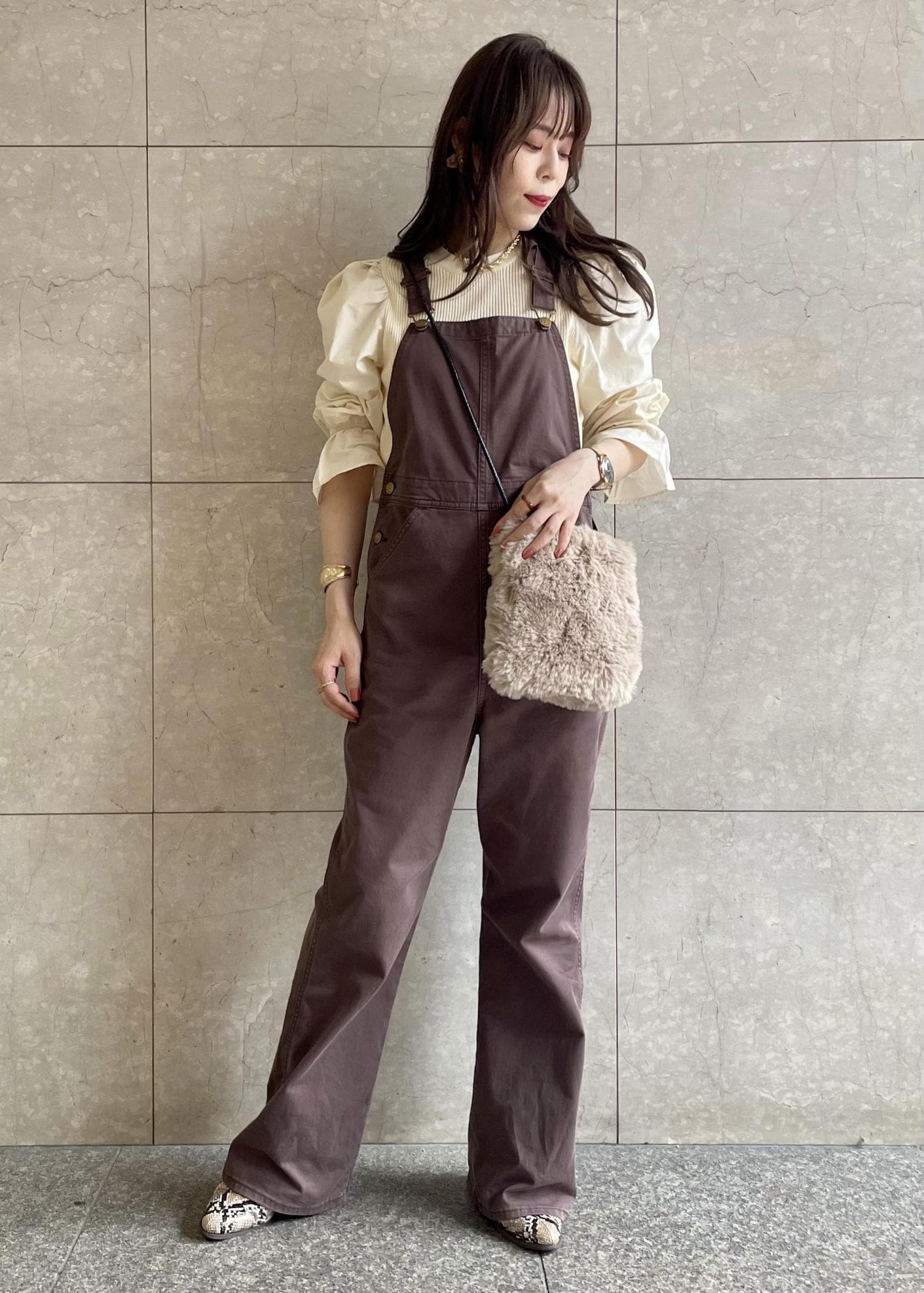 カジュアルなオーバーオールも、フェミニンなボリューム袖のニットと合わせて女性らしく。
