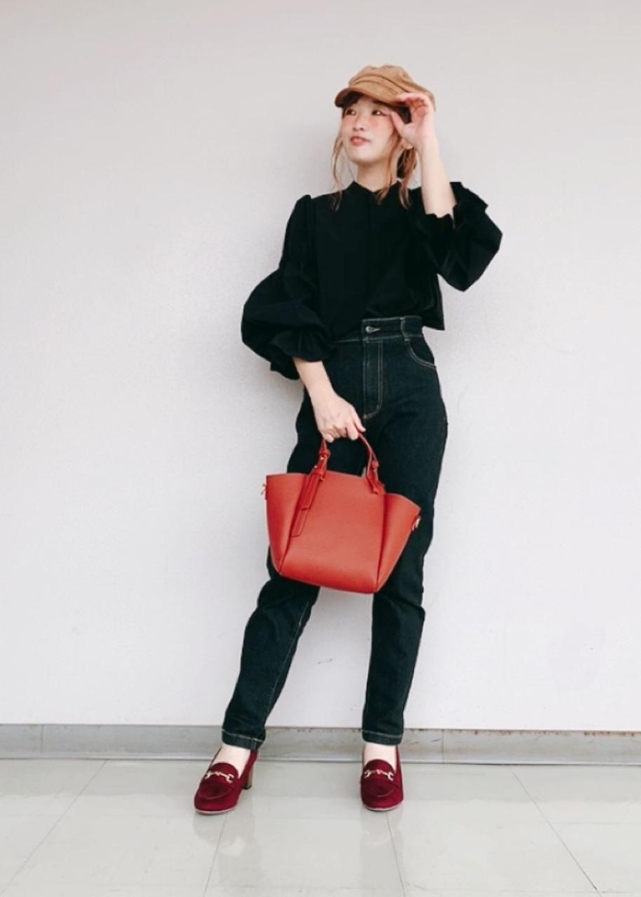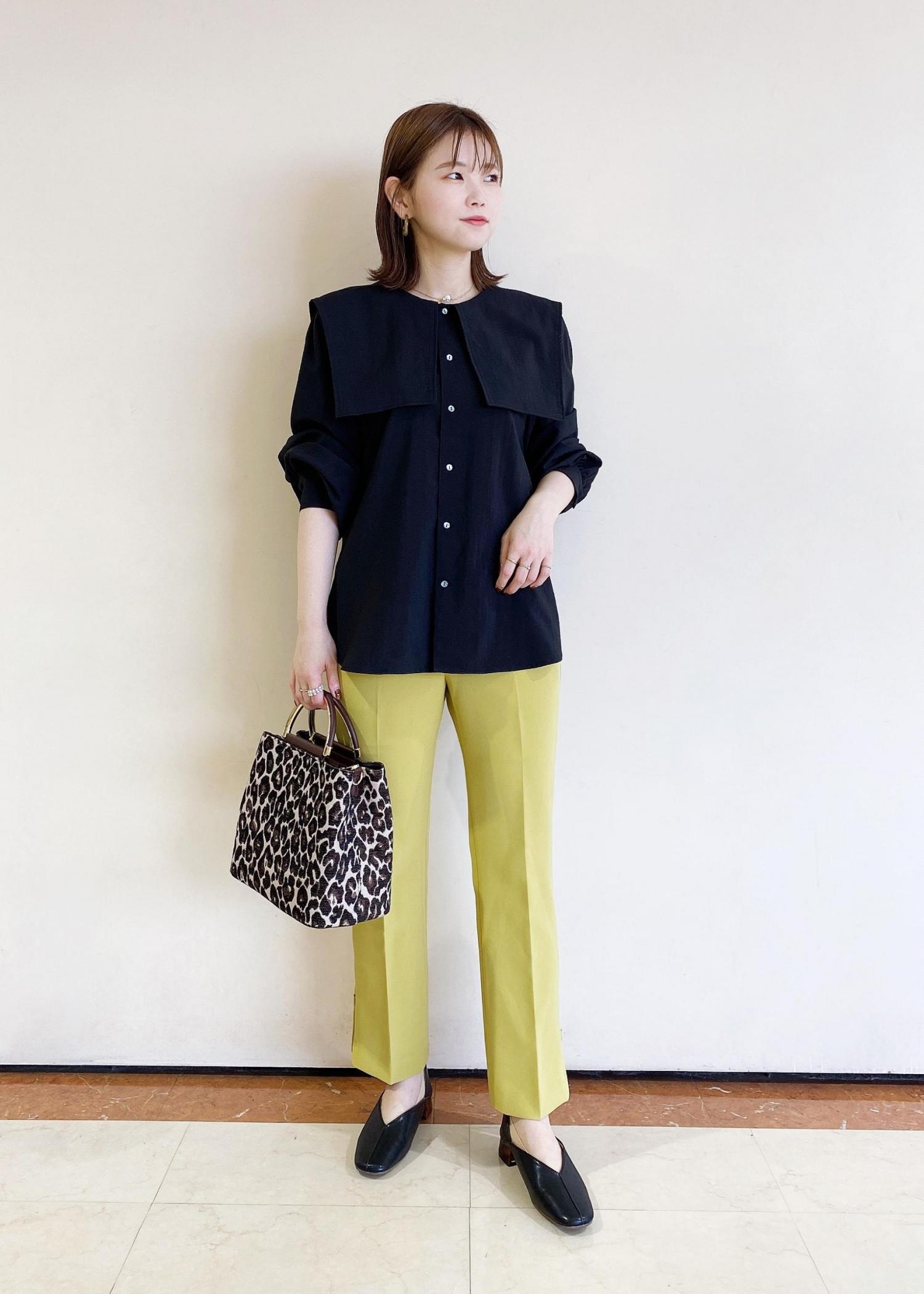 合わせたブラウスやパンツはそれぞれ華やかなデザインなので、バッグやシューズはシンプルにブラックで統一感を演出。