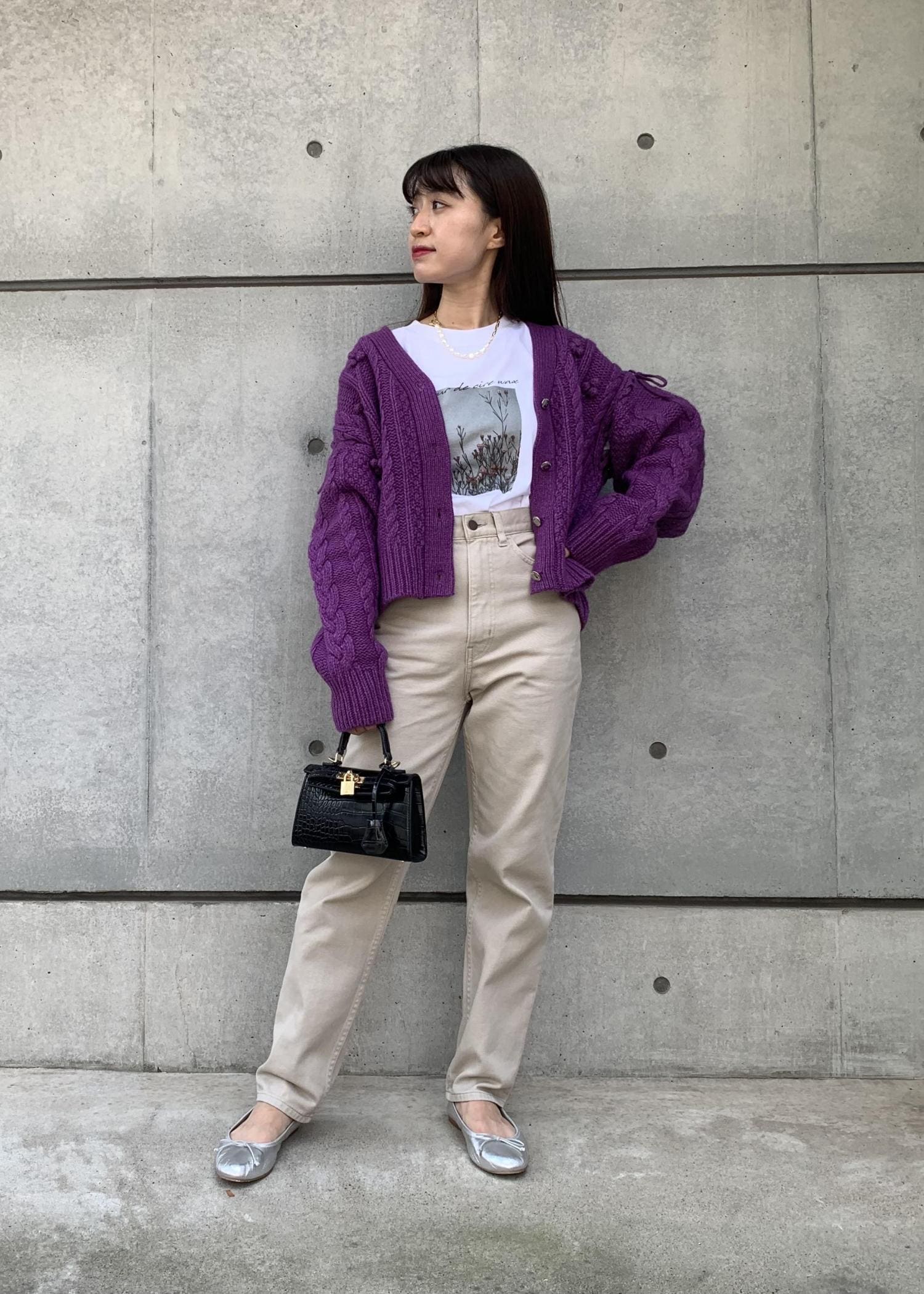 一枚で映えるカーディガンにカラーパンツで、秋に使えるコーデに。