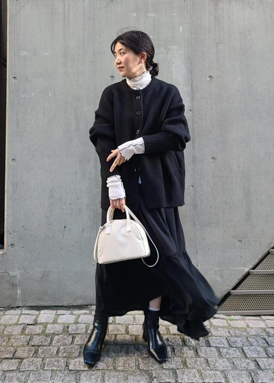 モヘアニットと揺れ感のあるロングスカートで異素材スタイリング