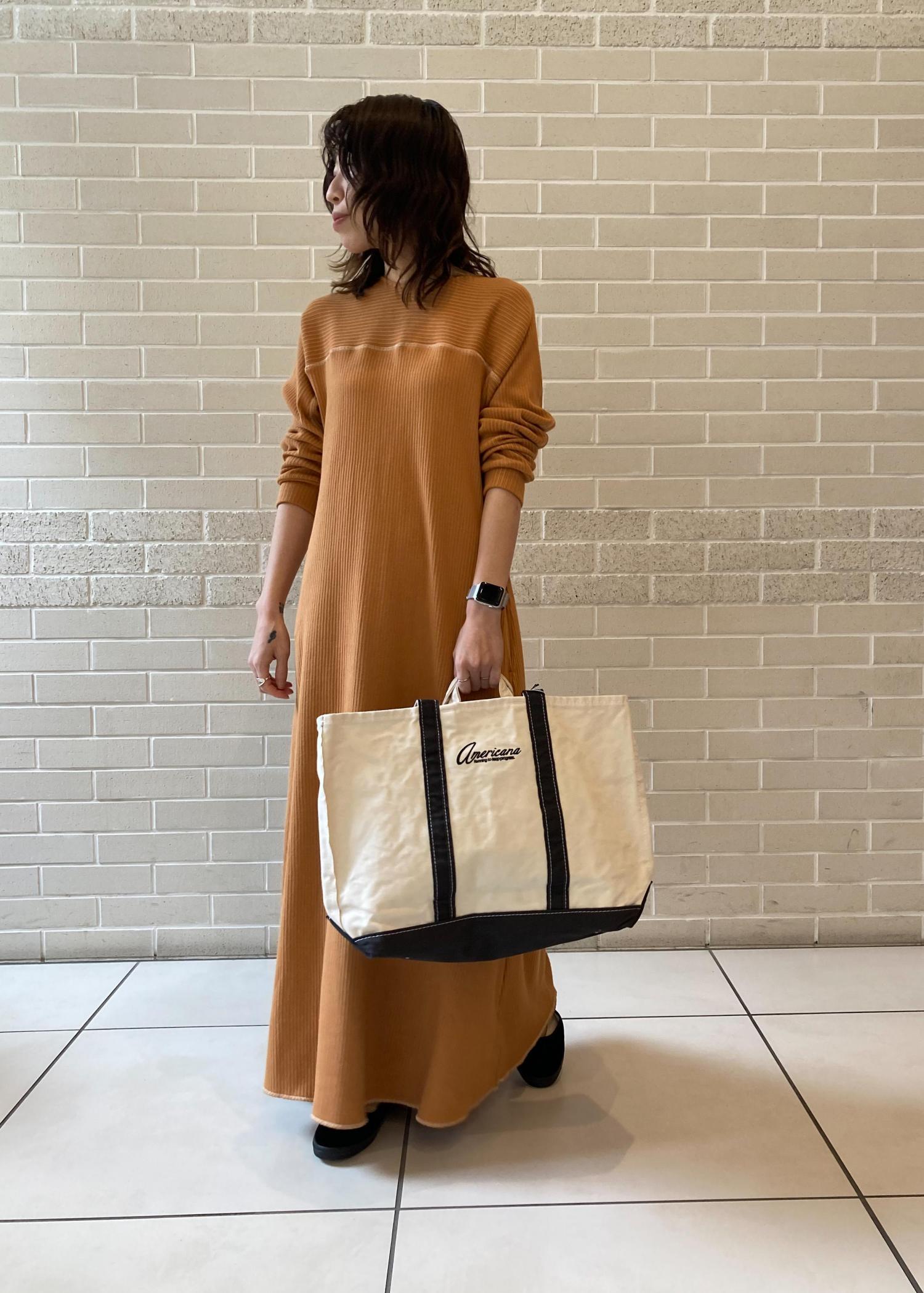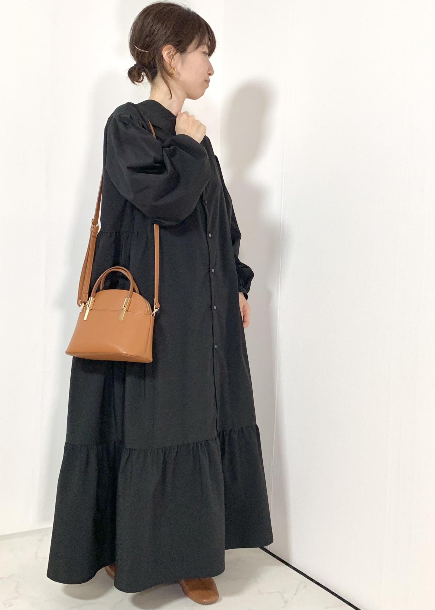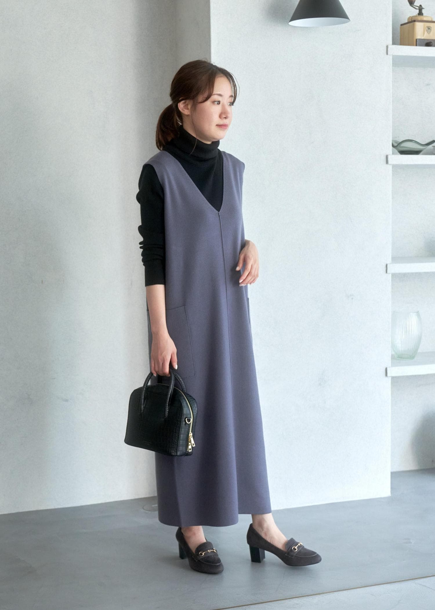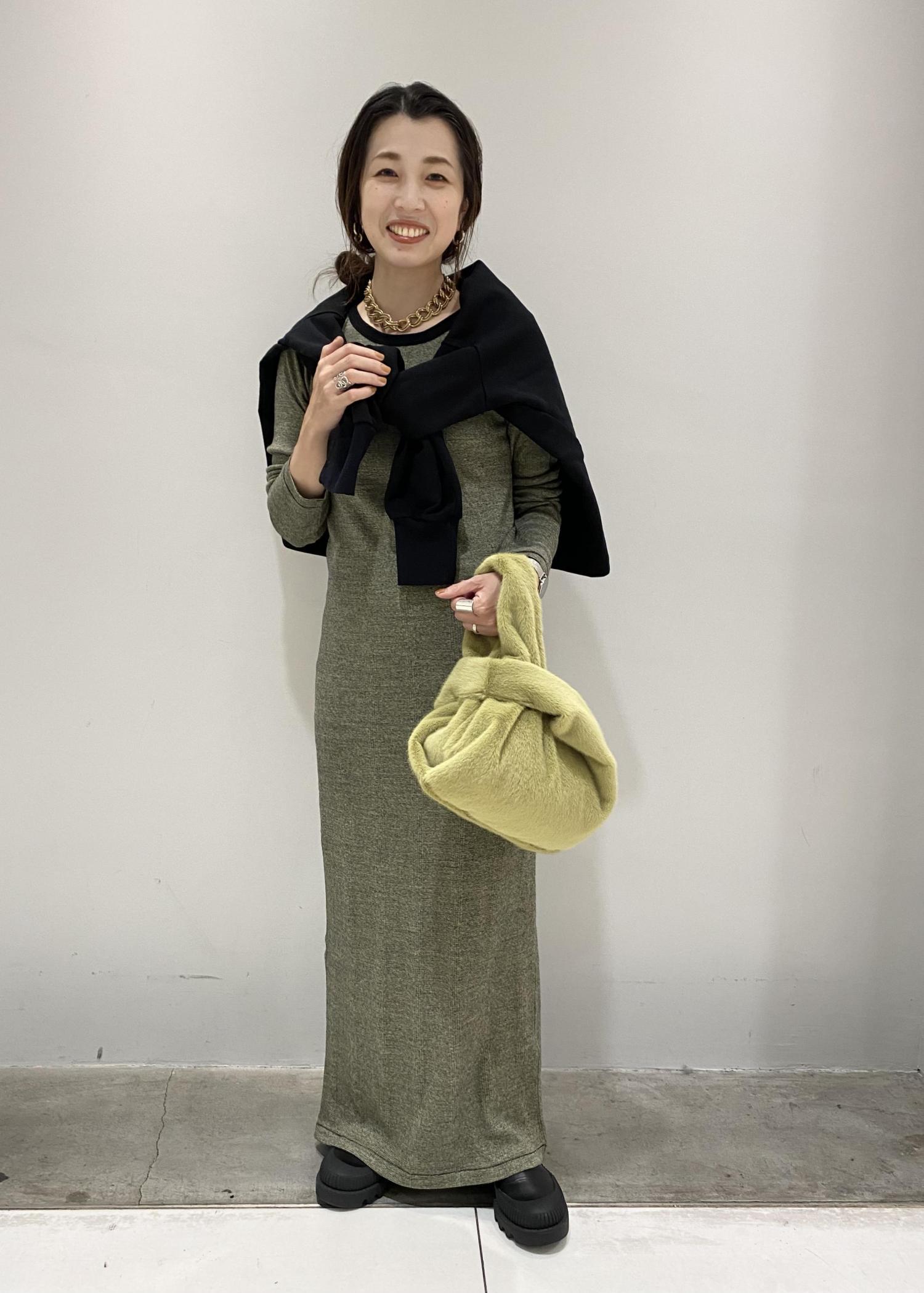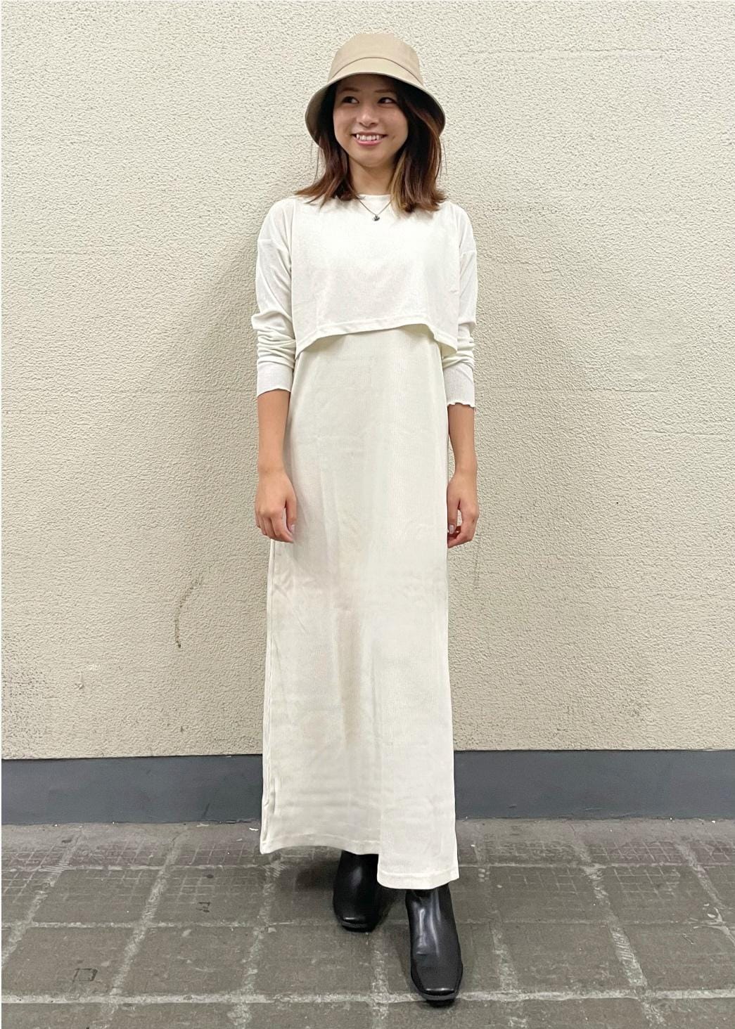 ロングのアウターとロングのワンピースを合わせて縦のラインを強調。