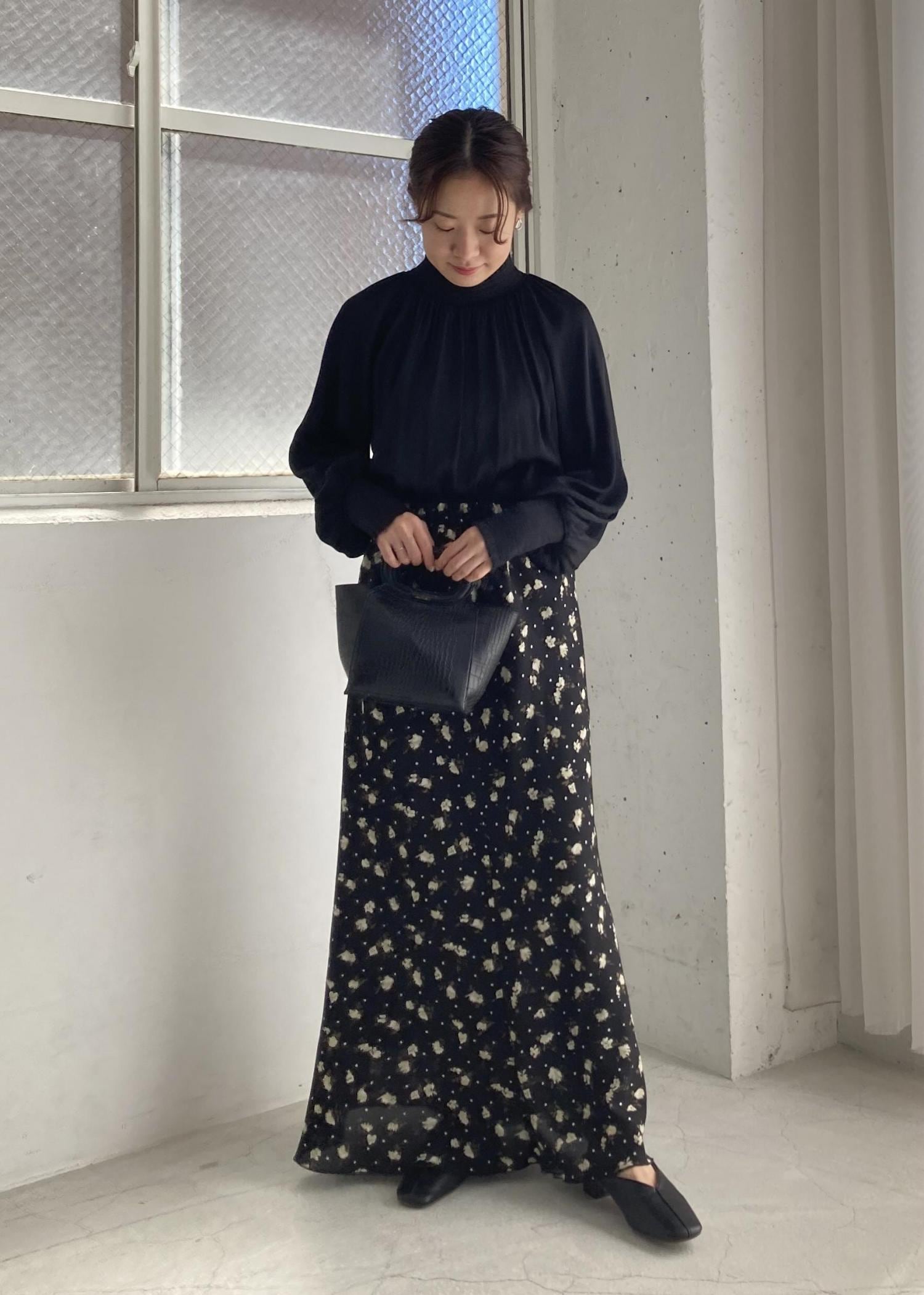 スカートを柄にしたことで、ブラックコーデも重くならず、かつマーメイドスカートが女性らしいシルエットを叶えます。