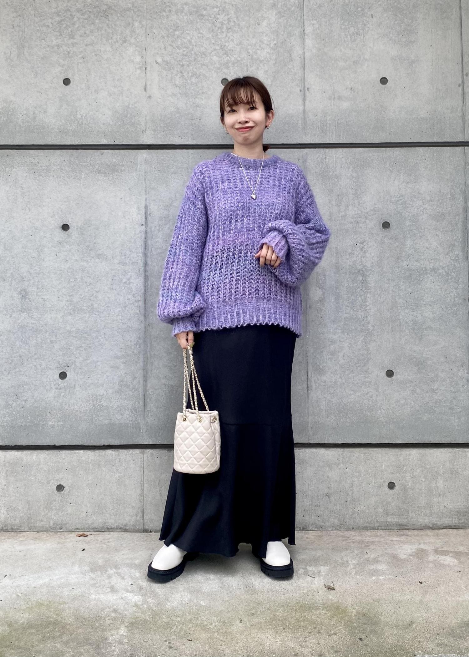 ホワイトのボリュームニットに、パープルのロングスカートを合わせたゆったりスタイル。