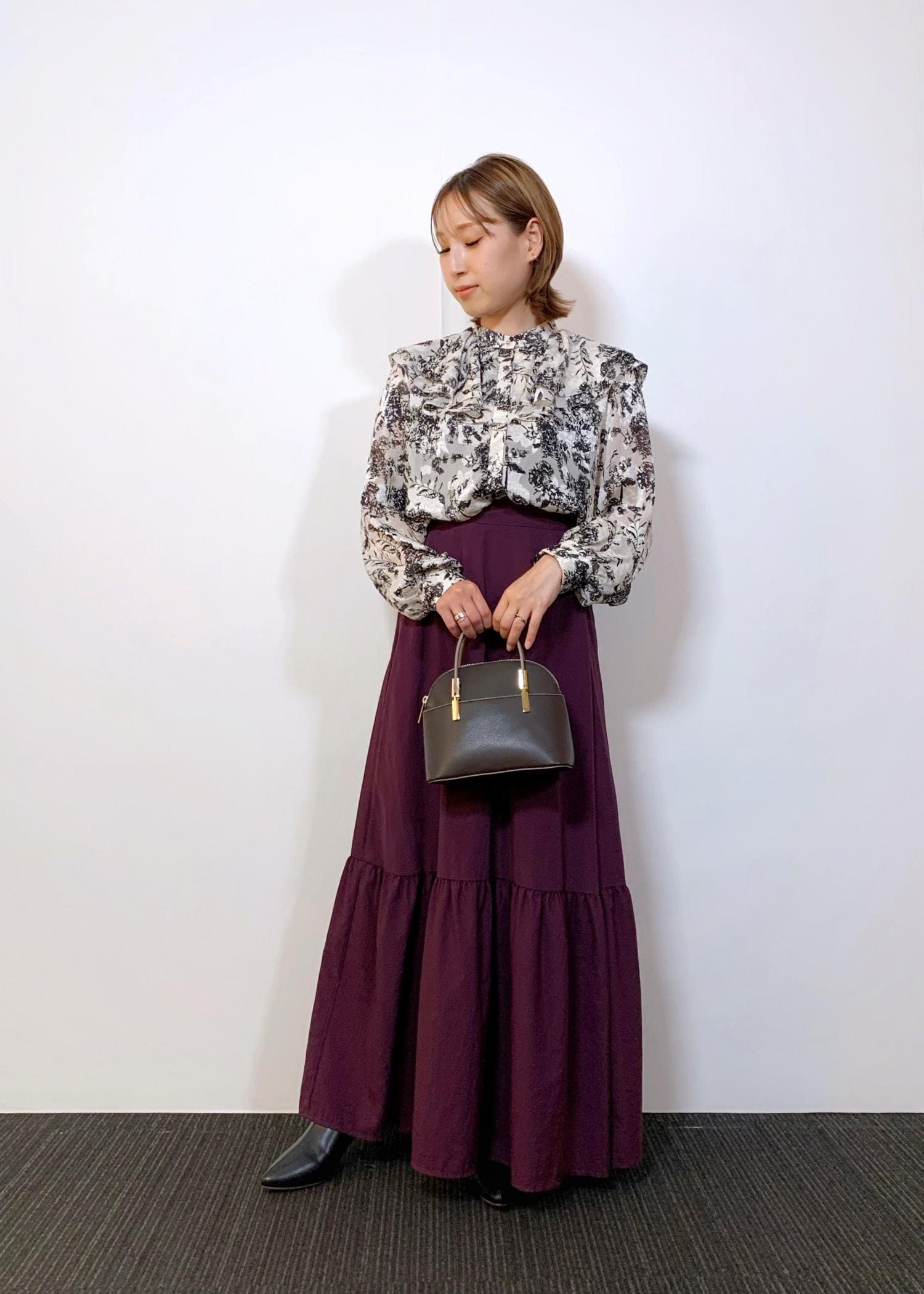 一枚で存在感のあるブラウスにバーガンディーのロングスカートを合わせてレトロな女性に。