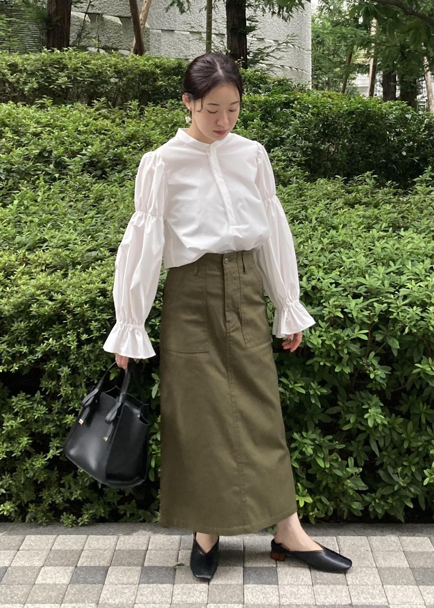 ボリュームのあるブラウスも、しっかりとインすればスッキリとしたスカートにもぴったり。