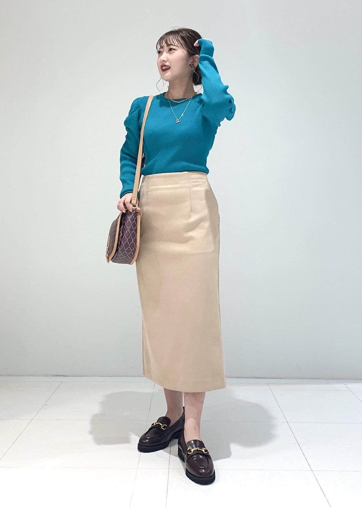 ほんのりモードかつ上品な雰囲気を演出してくれるボリューム袖が可愛いリブニットに、セミタイトスカートを選んで、縦長Iラインを意識したコーデに。