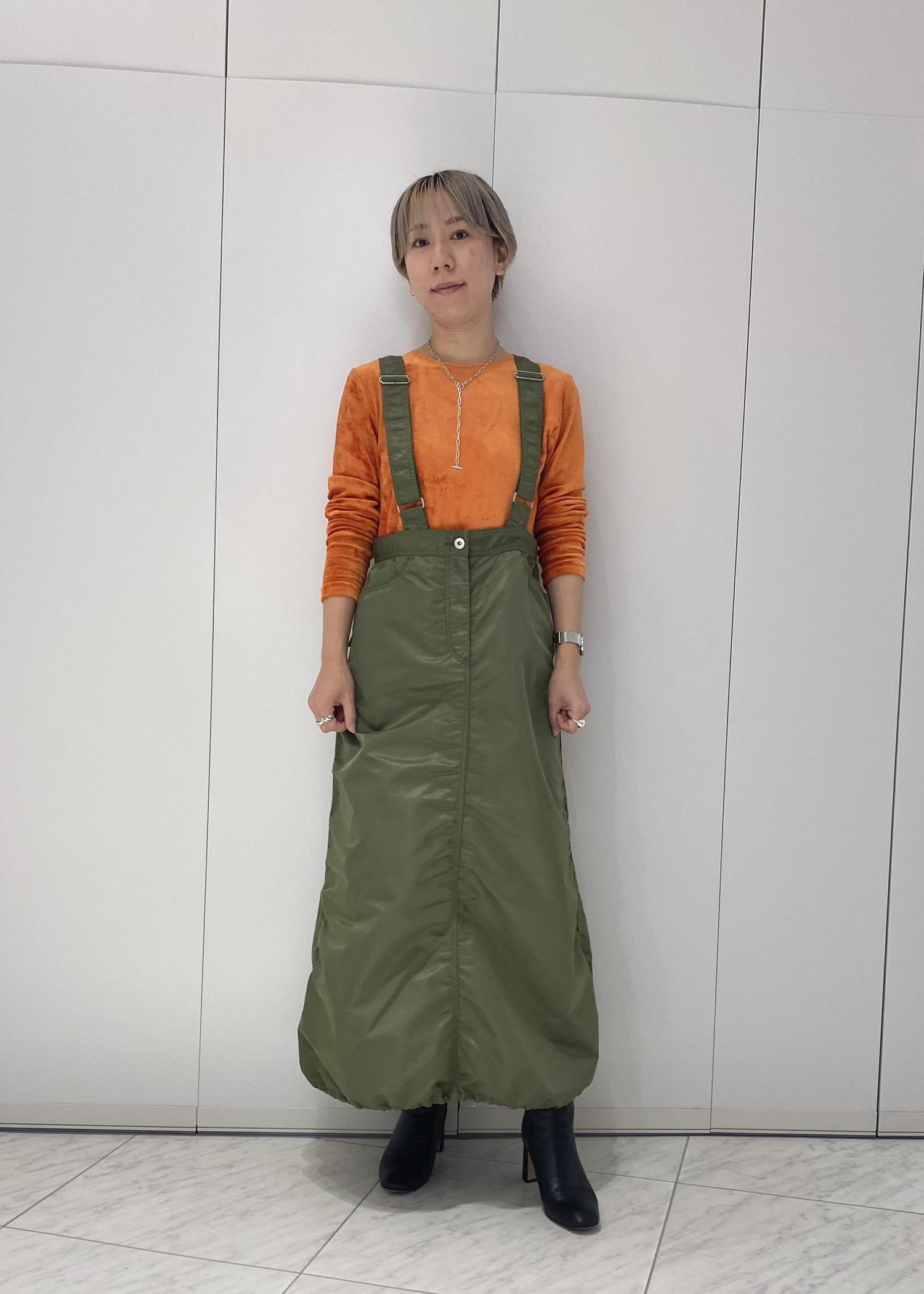 日によって気温が変わるこの時期にぴったりのサスペンダー付きのスカートは、合わせるインナーを変えればシーズンレスで着回せて長く愛用できる逸品。