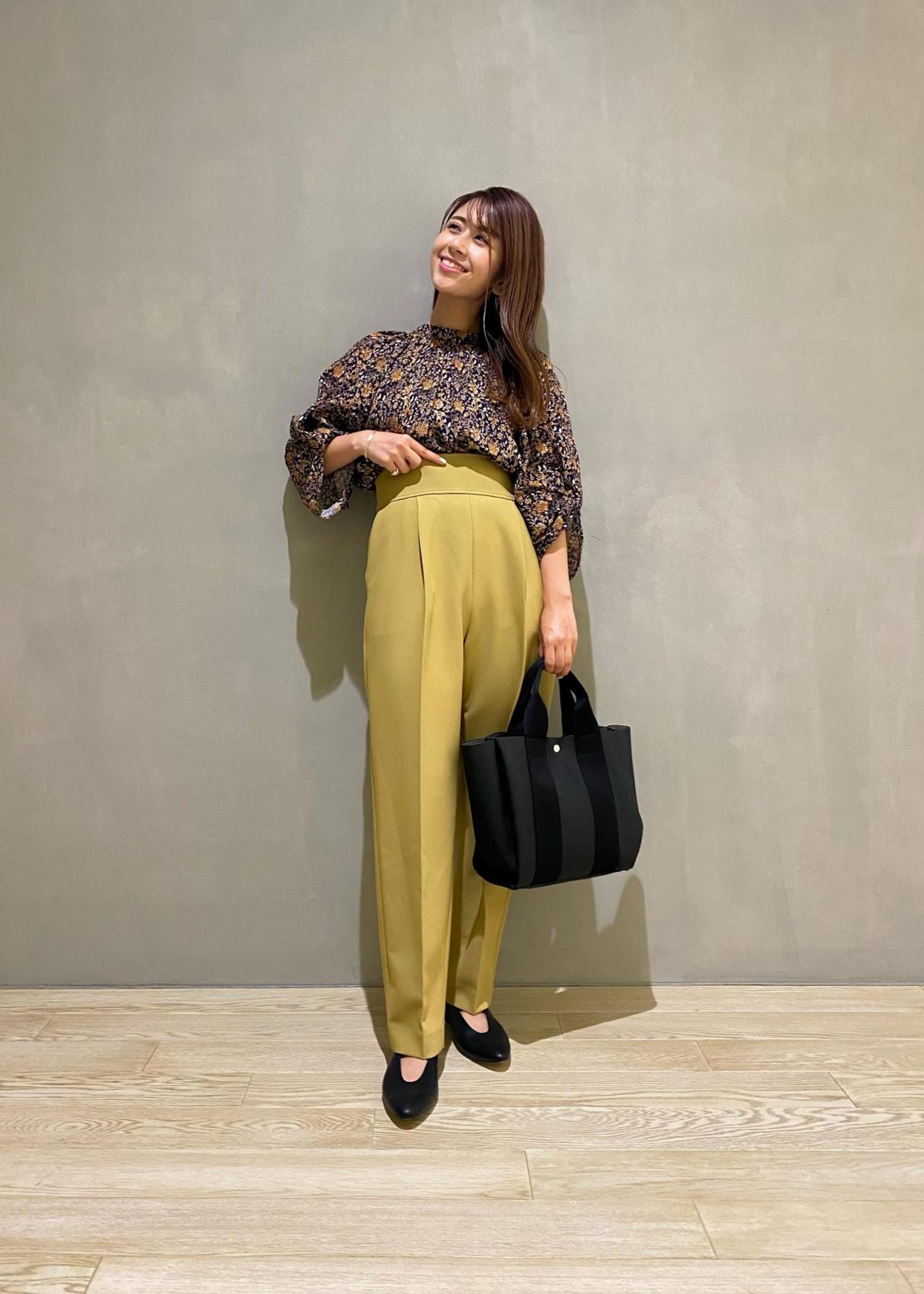 こっくりとした色味の花柄ブラウス × マスタードイエローのパンツを組み合わせ、秋を意識したカラーリングで今からでもすぐに着られるコーディネートに。