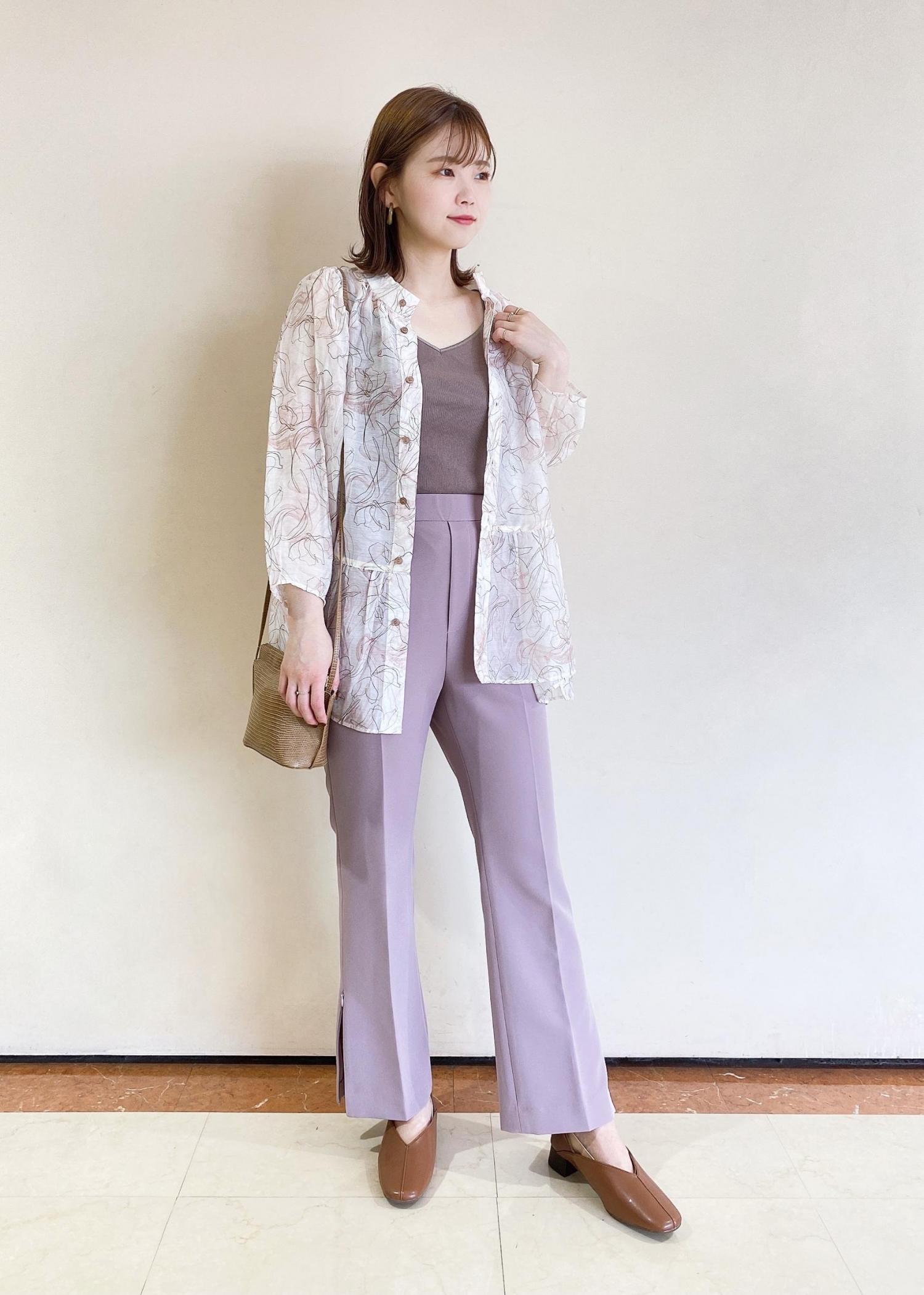 川上さやかさんコラボのシアーな肌なじみの良いニュアンスカラーブラウスを合わせて、今年らしくお洒落にスタイリング。