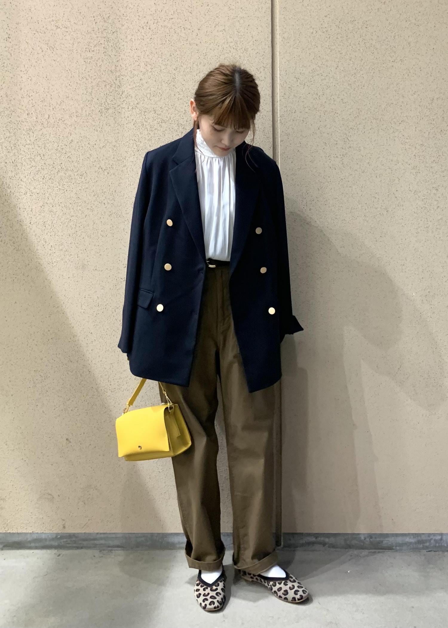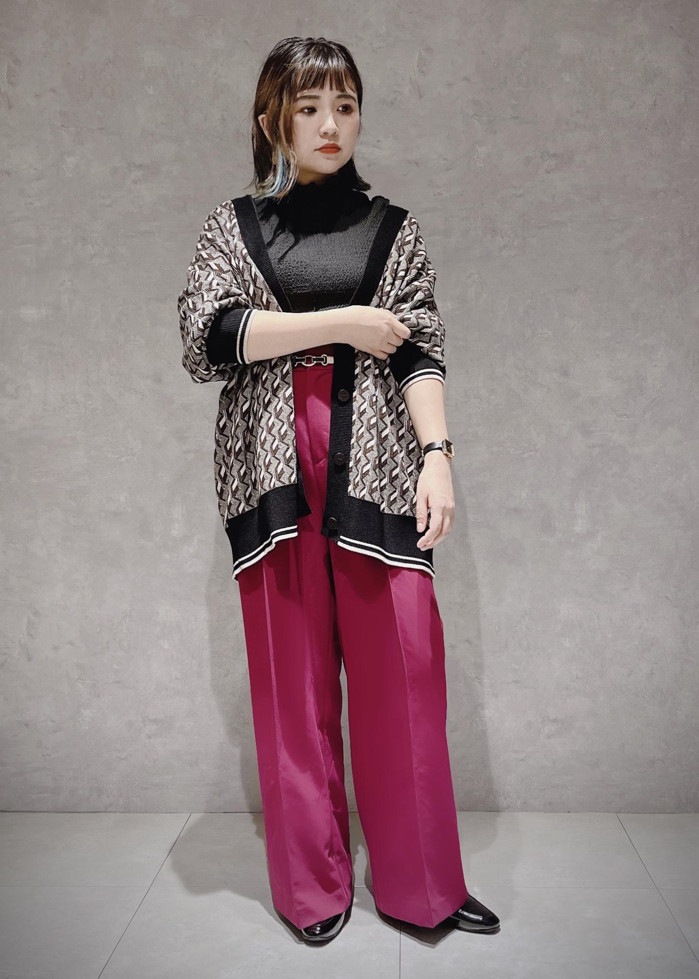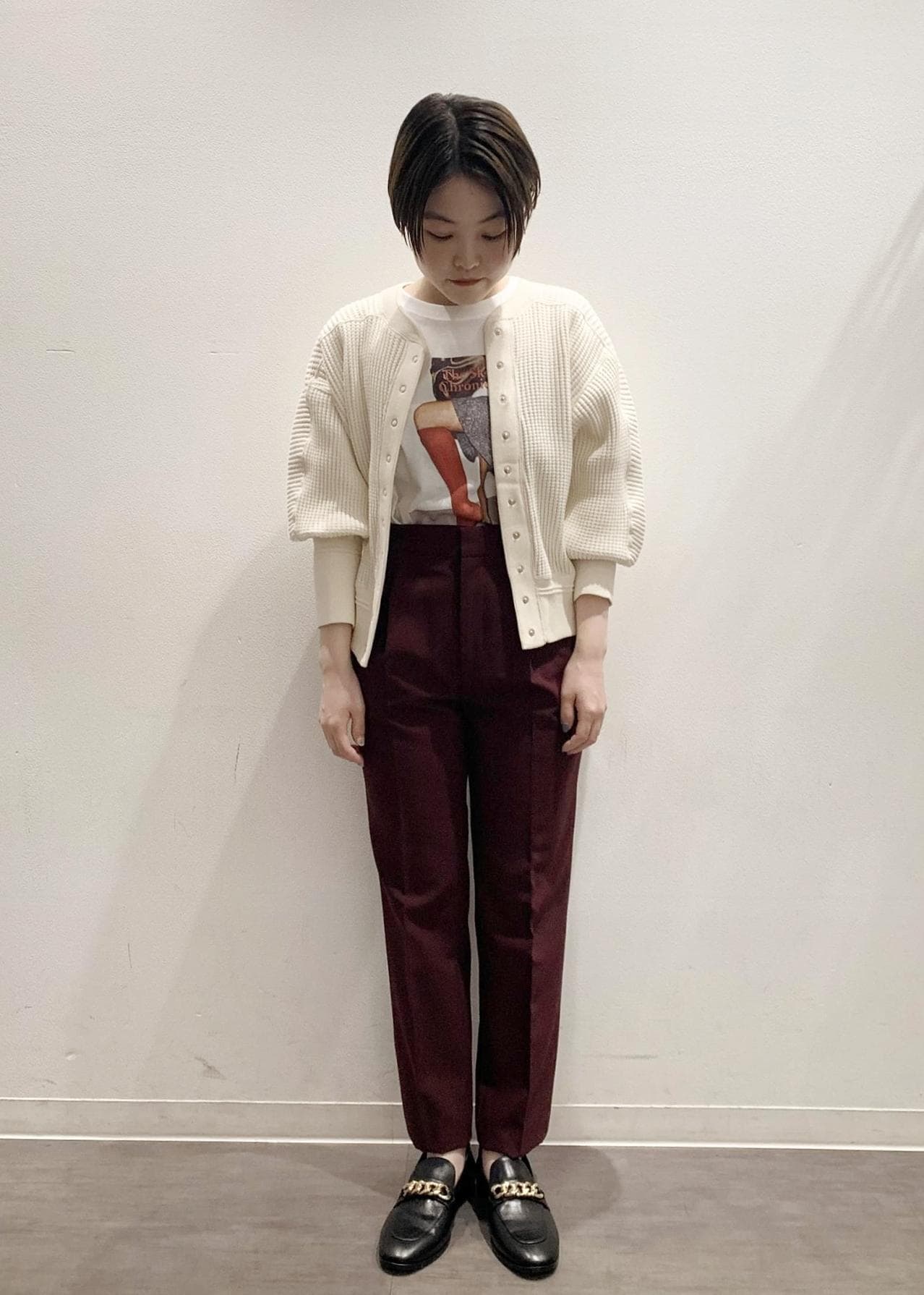 ボリュームのあるトップスにはきれいにスラックス合わせでシルエットもきれいに。
