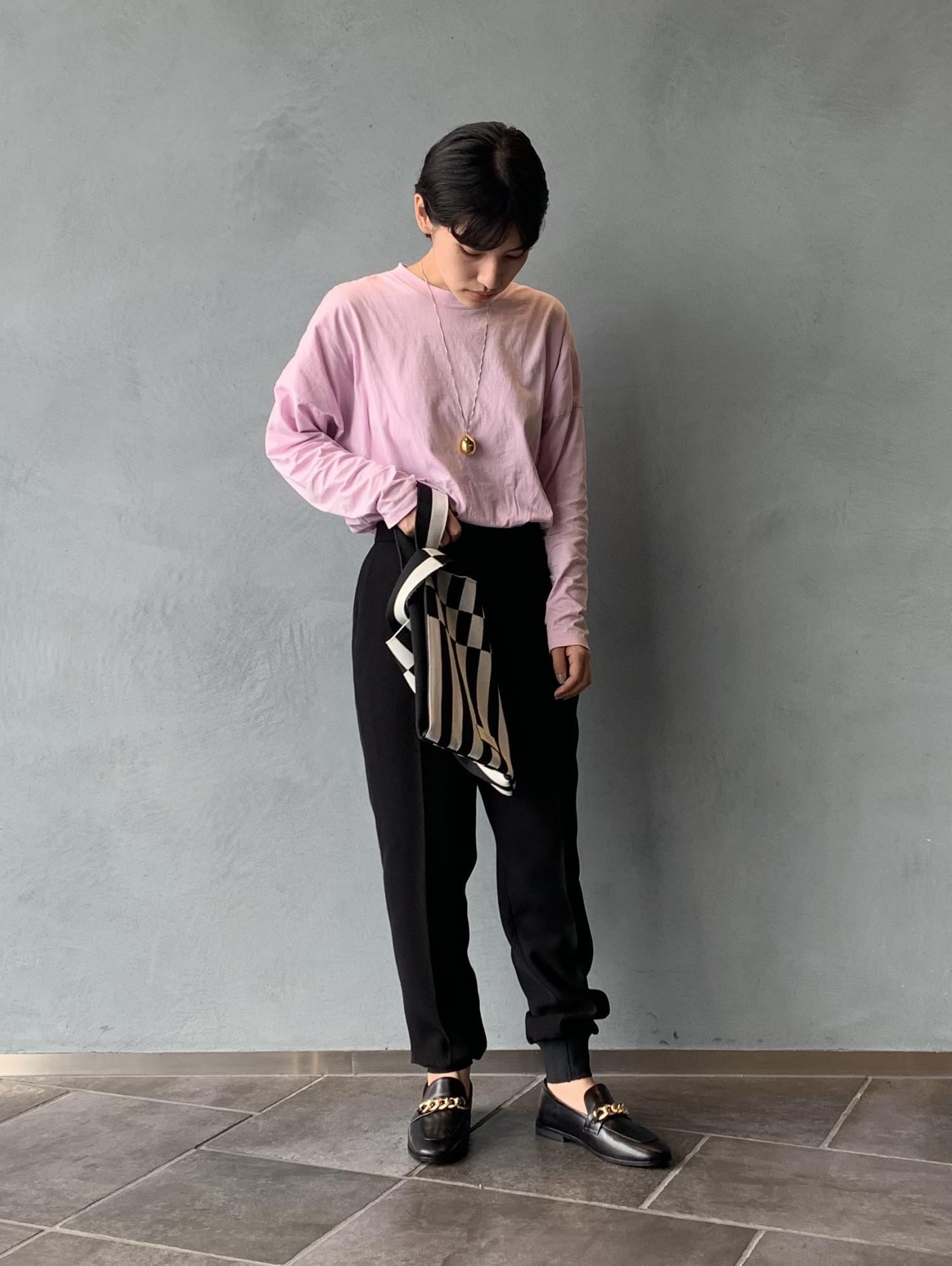 程よい光沢感と落ち感のあるパンツに、足元はローファーを合わせて、綺麗めなコーディネートに仕上げました。