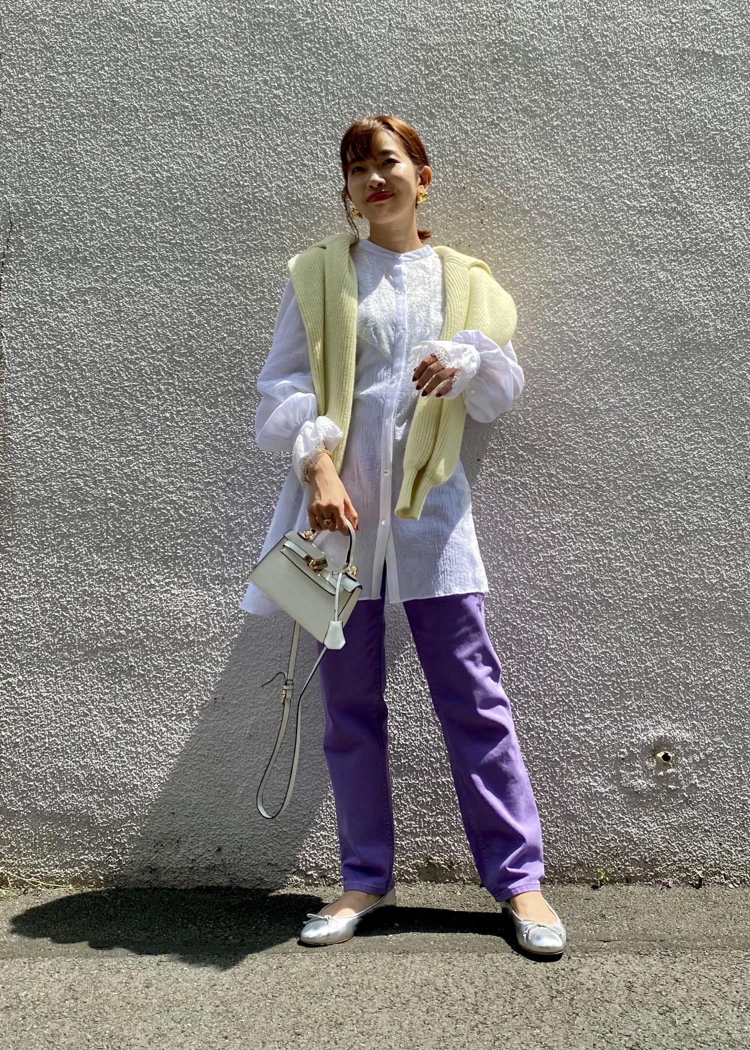 トップスが印象的なカラーの時は、ボトムはシンプルにコーディネート。