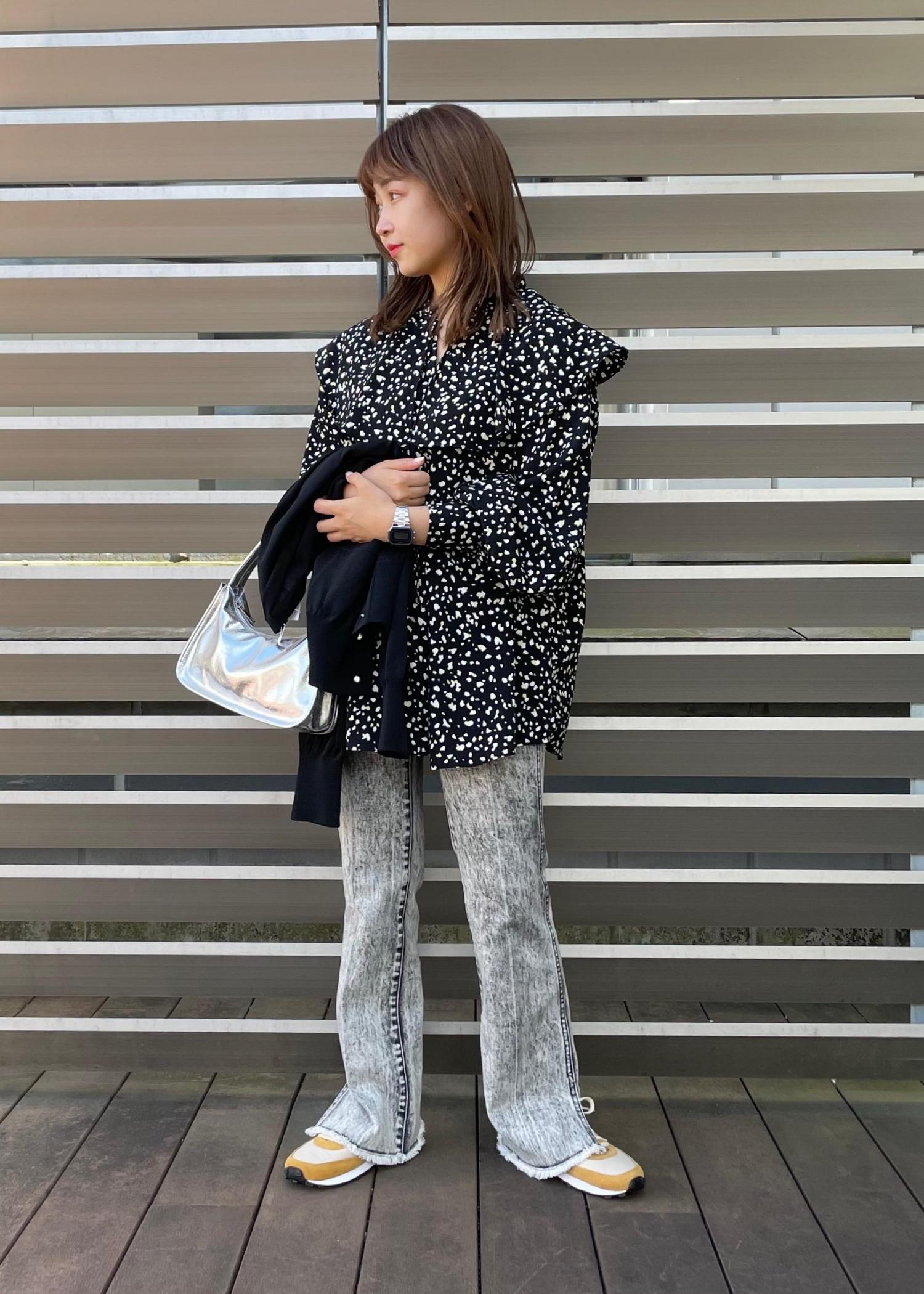 1枚で華やかなブラウスは、ブラックデニムとの合わせでカジュアルすぎず上品なコーデに。