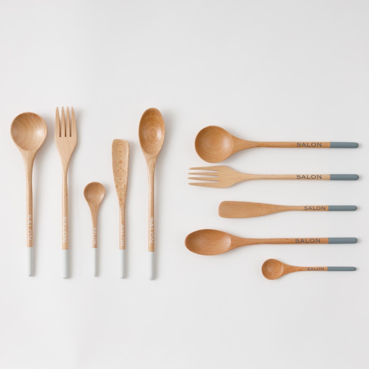 天然木を使用したカトラリーは和でも洋でも合わせやすいシリーズ。