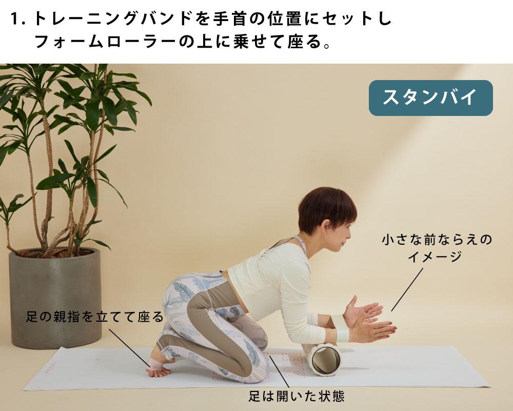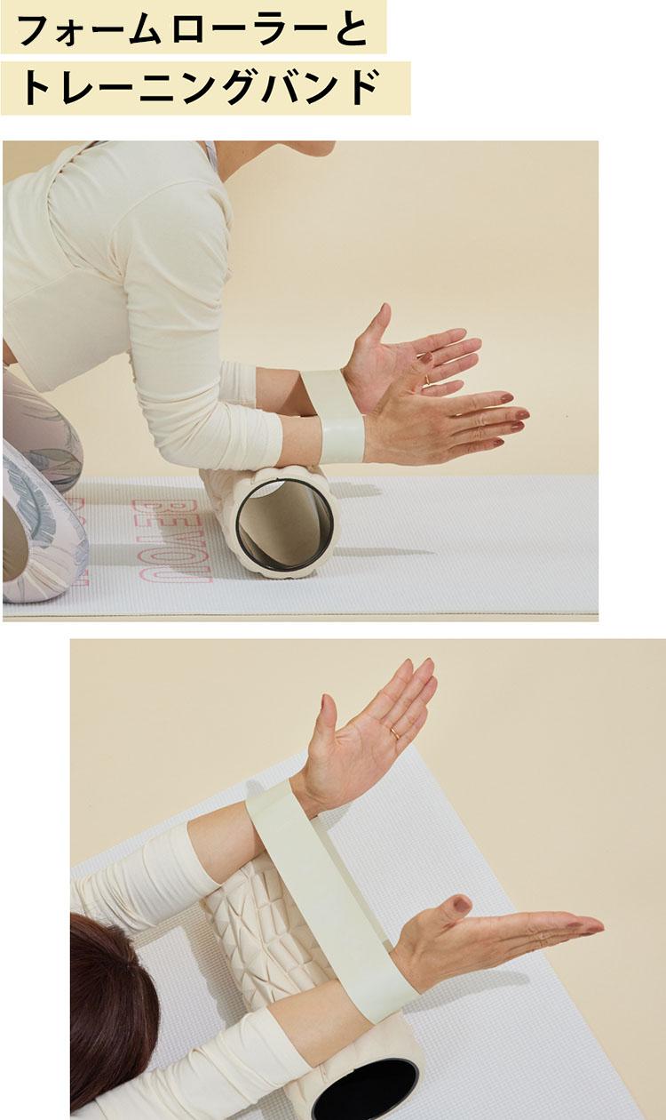 フォームローラーの穴に手を通し、小さな前習えをします。