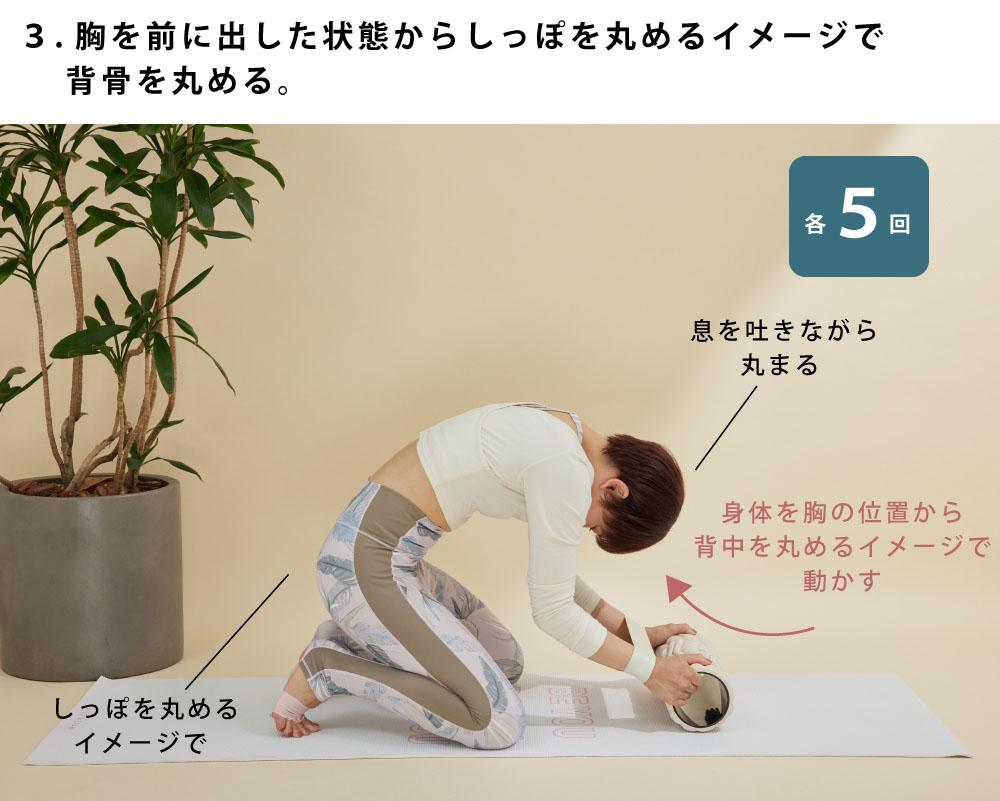 ローラーを背中にあて、ゆっくりとそのまま背中をそらせたり丸めたりする。