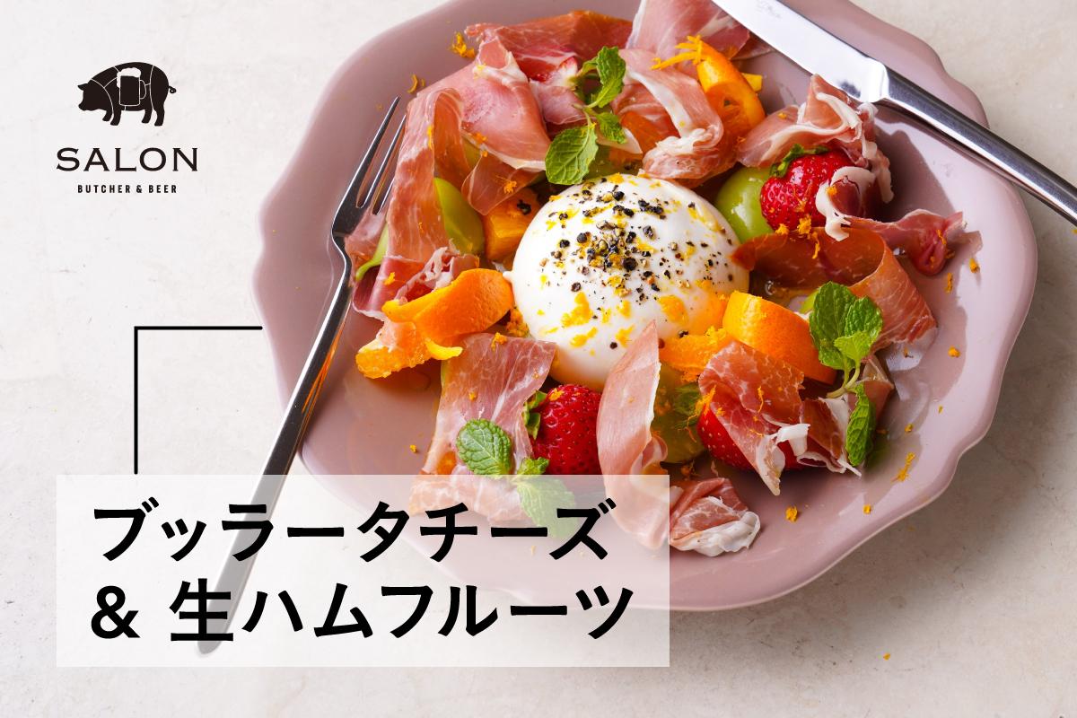 ブッラータチーズを真ん中に置いて、フルーツを生ハムをランダムに盛り付けるだけで、華やかサラダが完成!