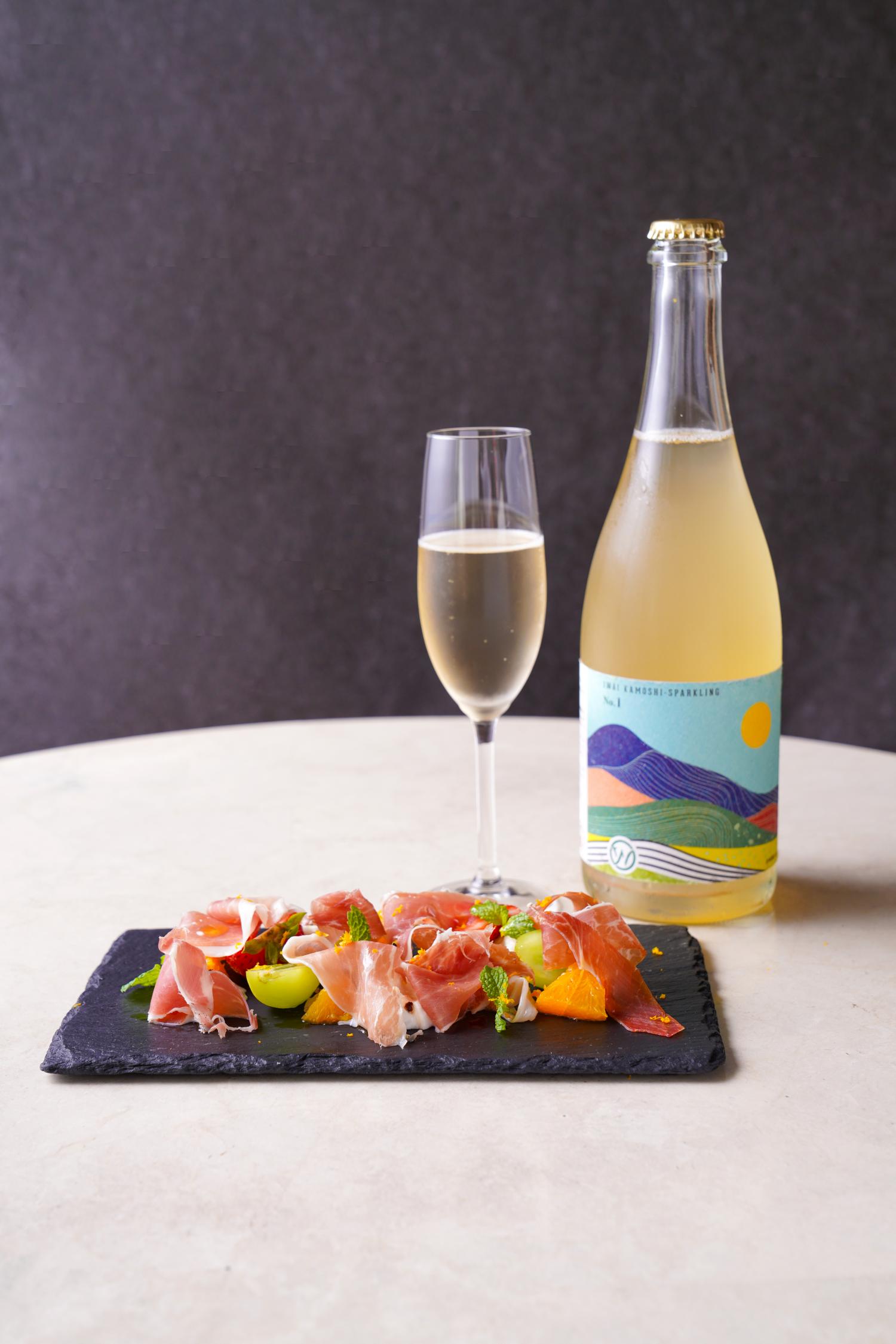 パルマ産生ハムの豊潤な味わい、爽やかな甘さと酸味の季節のフルーツ、ブッラータチーズのまろやかな口当たりが三味一体となった贅沢な生ハムフルーツ。「IWAIKAMOSHI-SPARKLING No.1」にピッタリの前菜です。