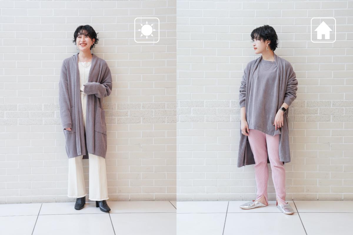 ざっくりと羽織れるガウンタイプのカーディガンは、包み込んで切れる安心感と体形カバーもしつつ動きやすいのもお気に入り。