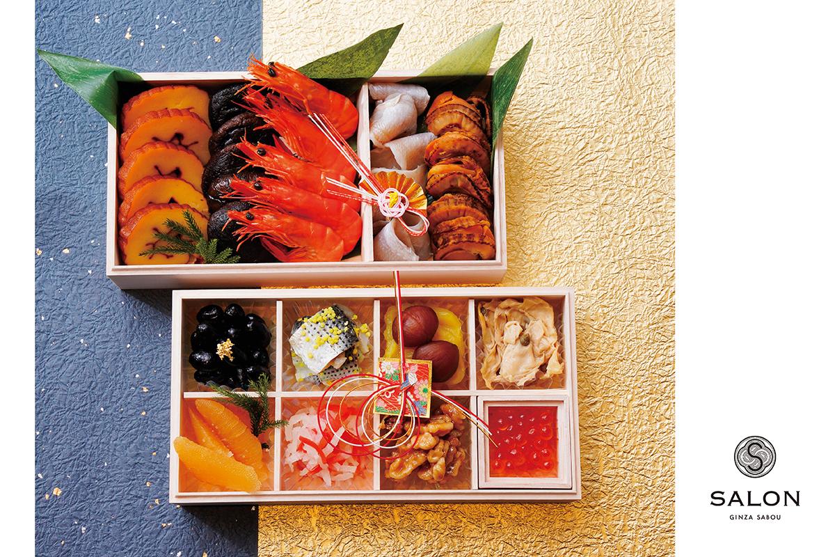 SALON GINZA SABOUのお節は、定番の物から高級食材、地方の伝統的な食材を織り込んだ化学調味料・人工甘味料・合成着色料・人工保存料不使用の無添加にこだわり、自然で上品な味わいに仕上げております。身体想いでありながら、福を招く多彩な食材が13種類。