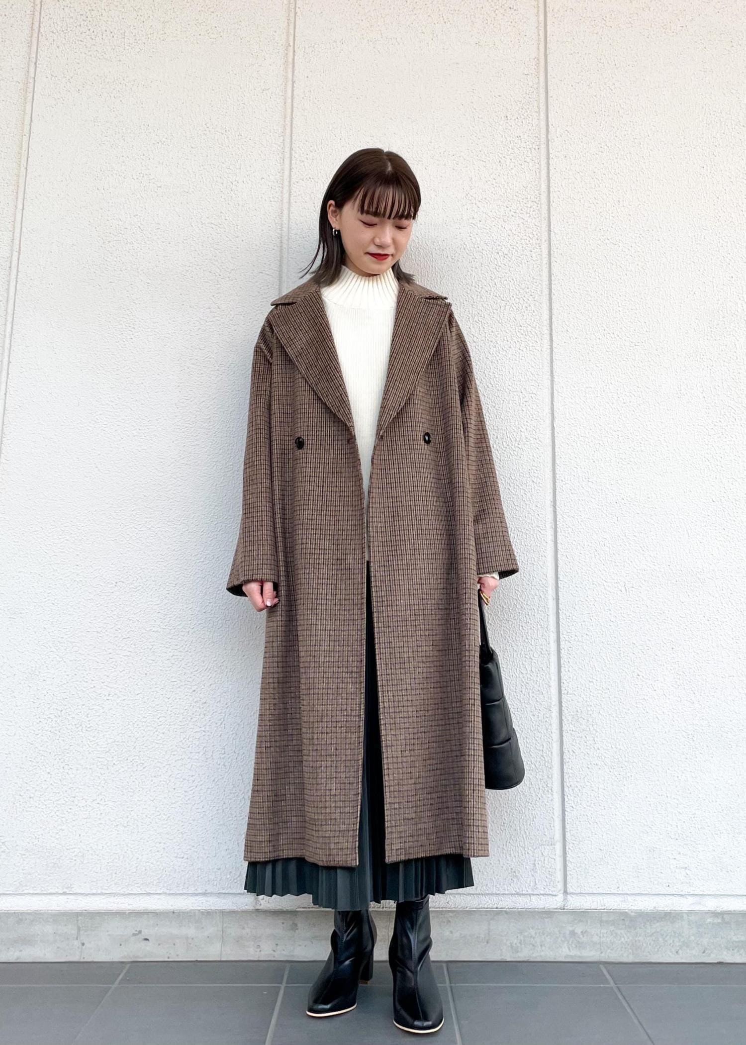 モノトーンコーデにガンクラブチェックのアウターを羽織りチェック柄が際立つコーディネート。コートはオーバーサイズでゆとりがあり厚手のニットの上からでも羽織りやすいのでこれからの時期におすすめです。