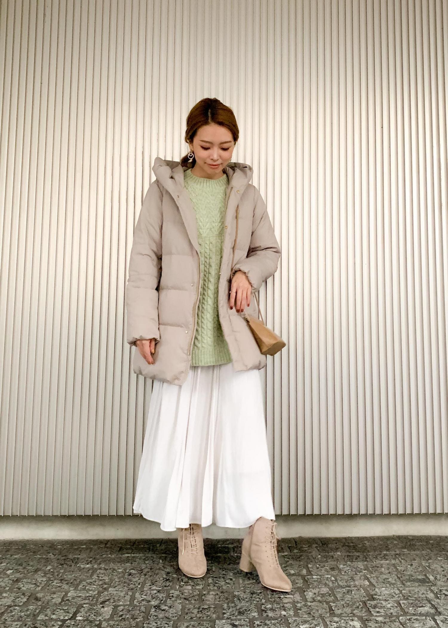 ヒップが隠れるミドル丈が暖かいダウンコートにスカートを合わせたスタイリング。インナーに柔らかい印象になるライトグリーンのニットを合わせて、年末年始のお出かけにお勧めコーデです。