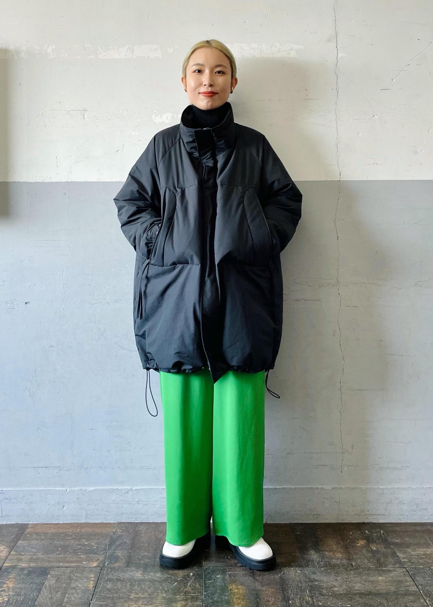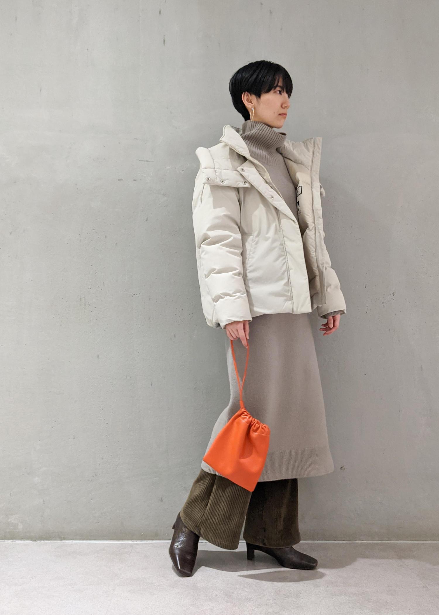 米国カリフォルニアを拠点とする世界有数の羽毛サプライヤーALLEID(アライド)社のダウンを使用したアウター。本格ながら抜け感のあるデザインで、大きめのフードと広めに取ったスタンドカラーは、顔から離れたサイズ感で小顔効果抜群です。