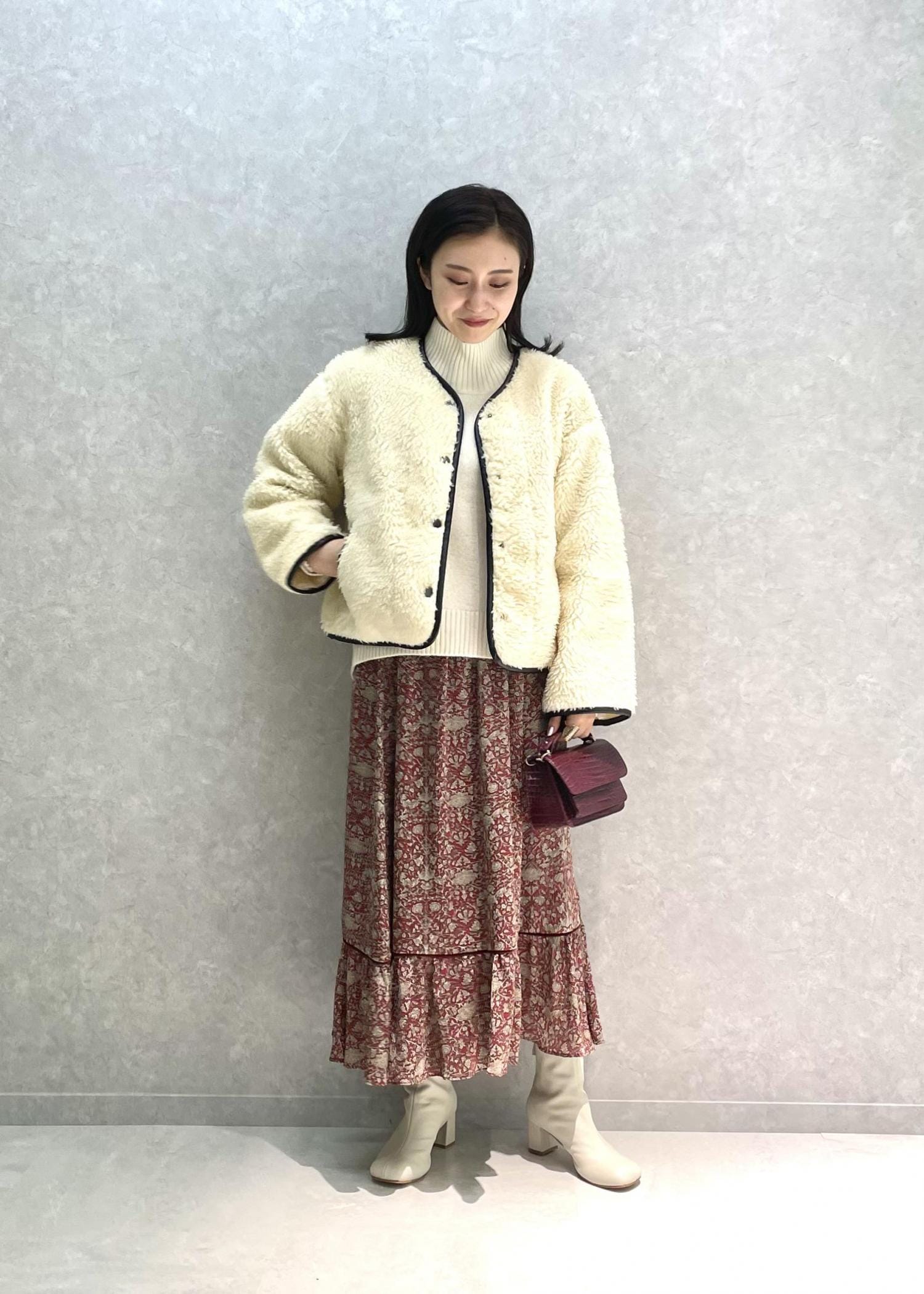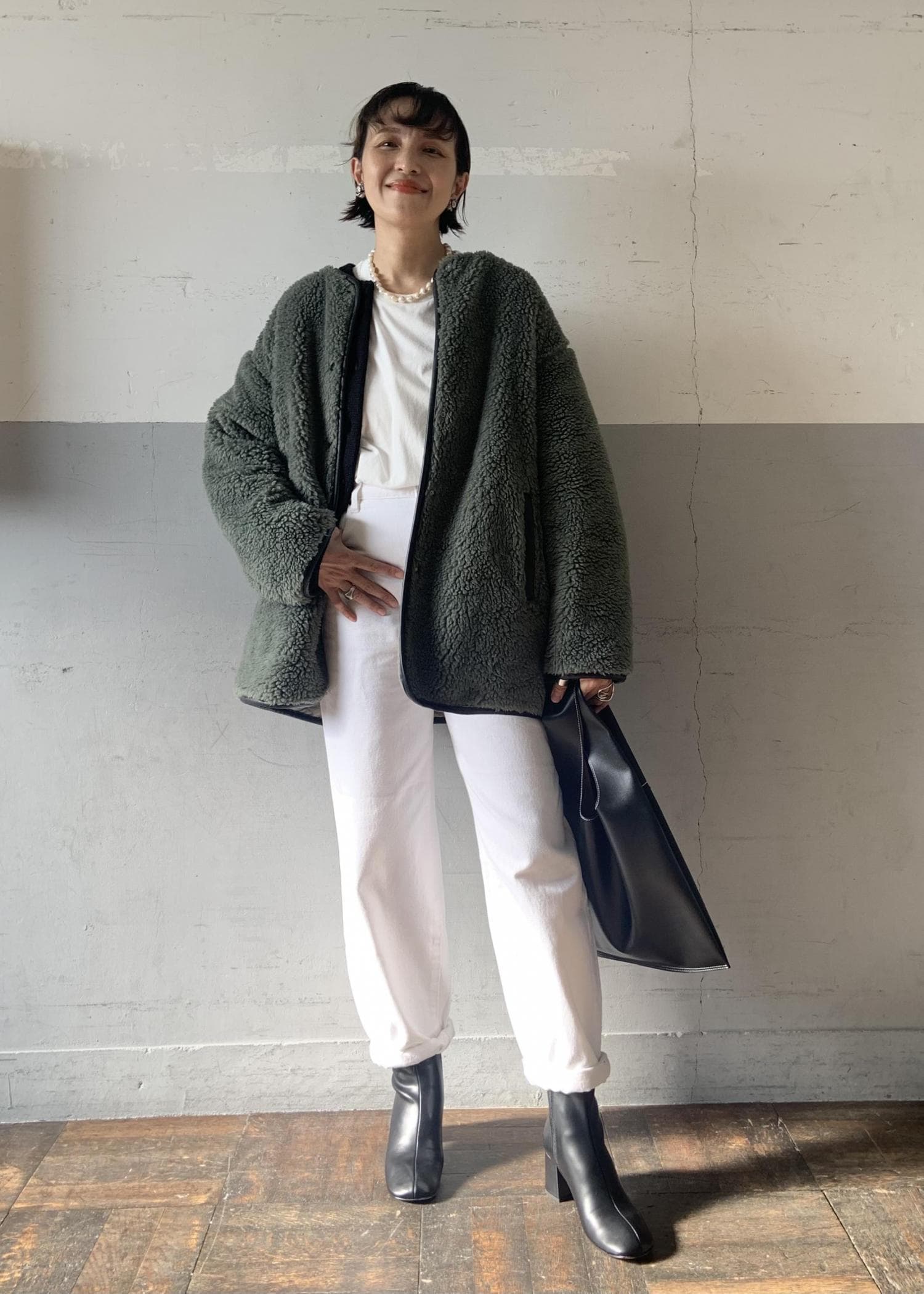 ミラノリブニットとプリーツスカートを黒で合わせてセットアップ風の装い。白のボアムートンジャケットを羽織って重たすぎないようにしつつ冬を意識したコーデに。