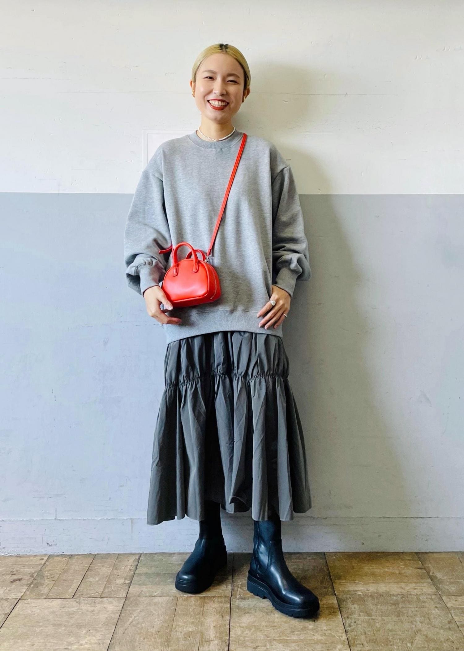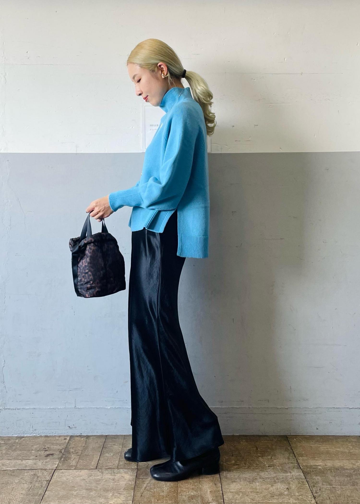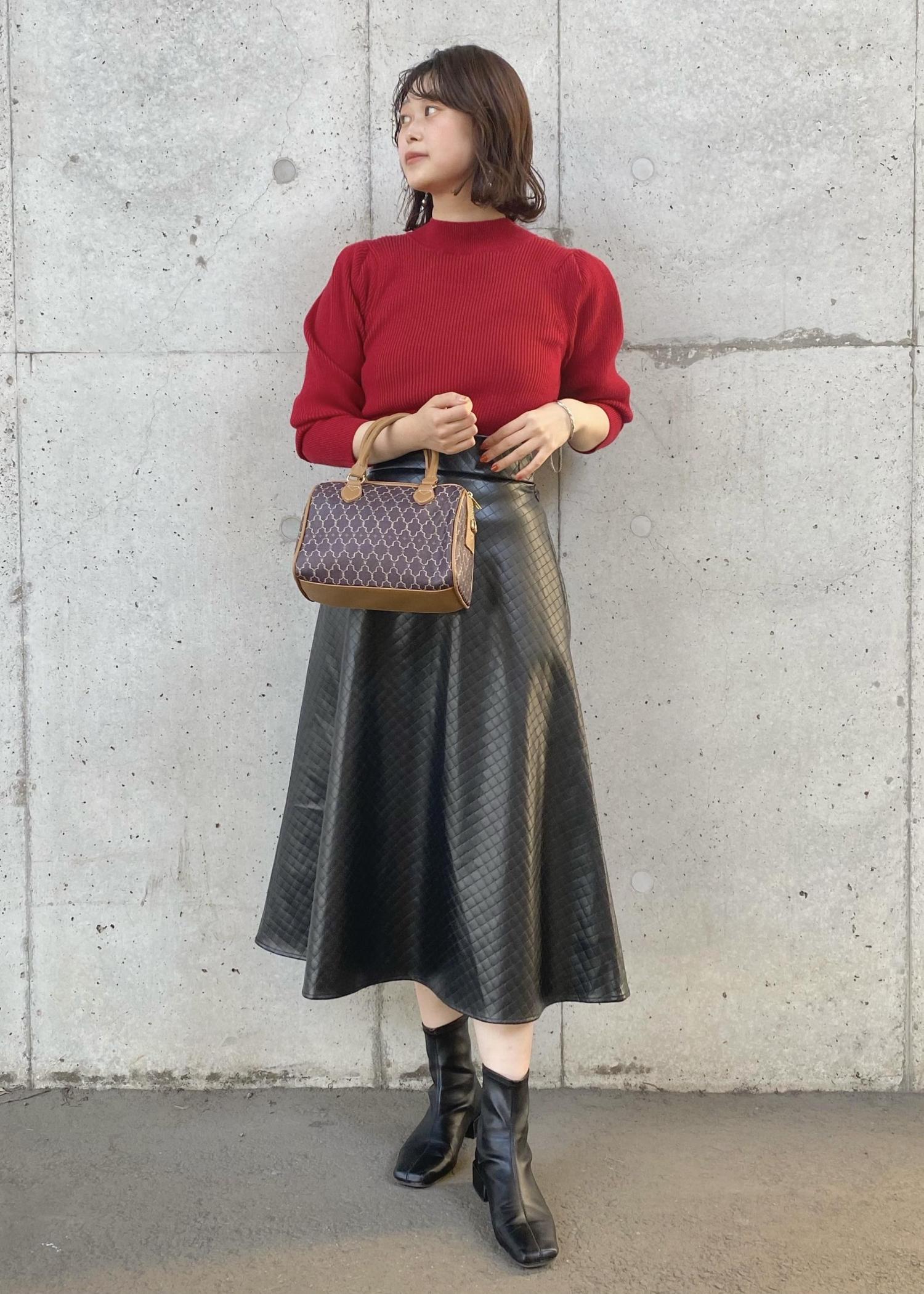 ローズピンクの色味が一瞬で目を惹かれるリブニットに、柔らかいレザースカートを合わせて。アウターを脱いだ時に見えるヘルシーな肌見えでいつもと違う印象に変わります。
