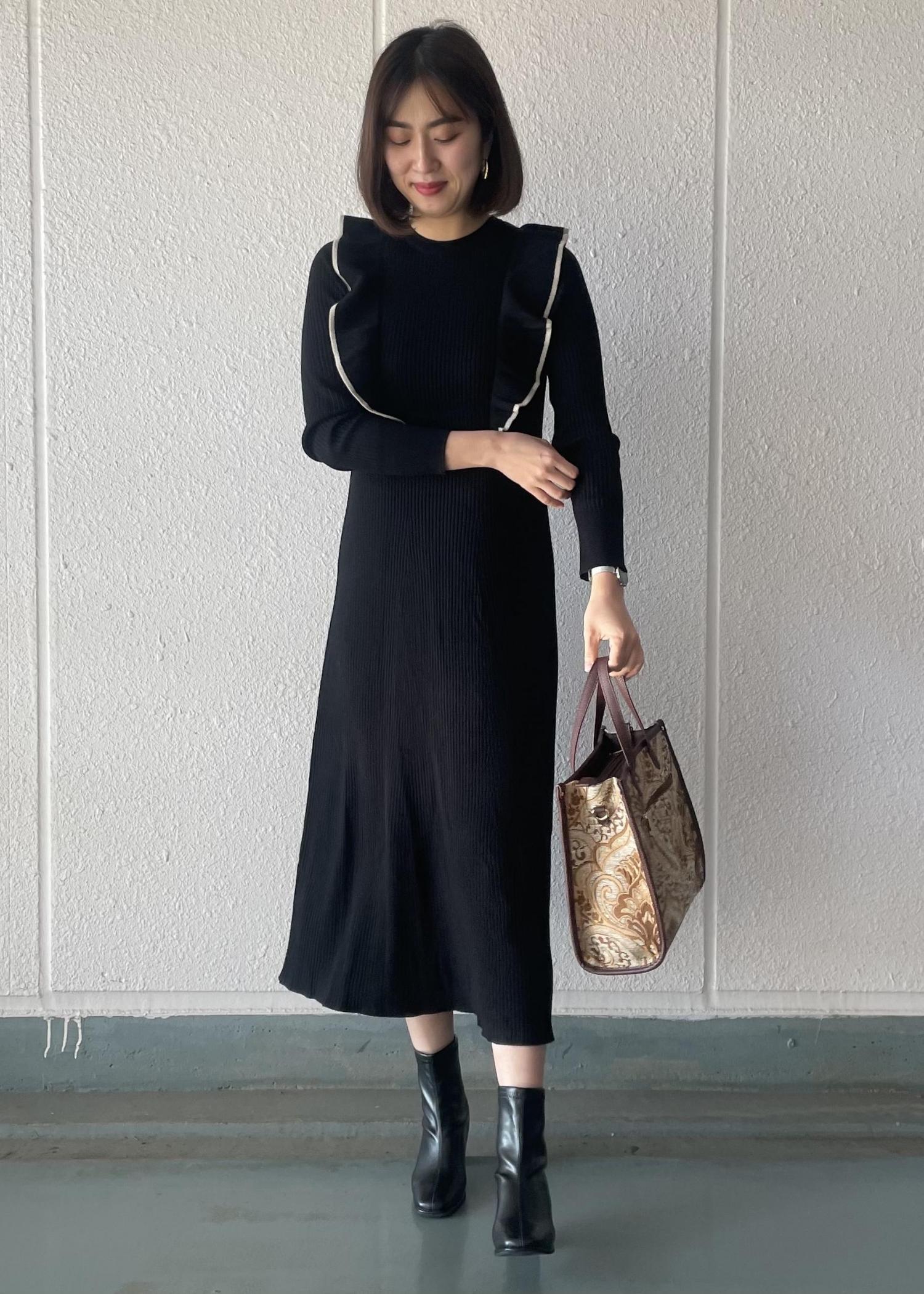 これからクリスマスシーズンに向けて、簡単に着映えるフリルデザインのワンピースは万能アイテム。縁のバイカラーがポイント。