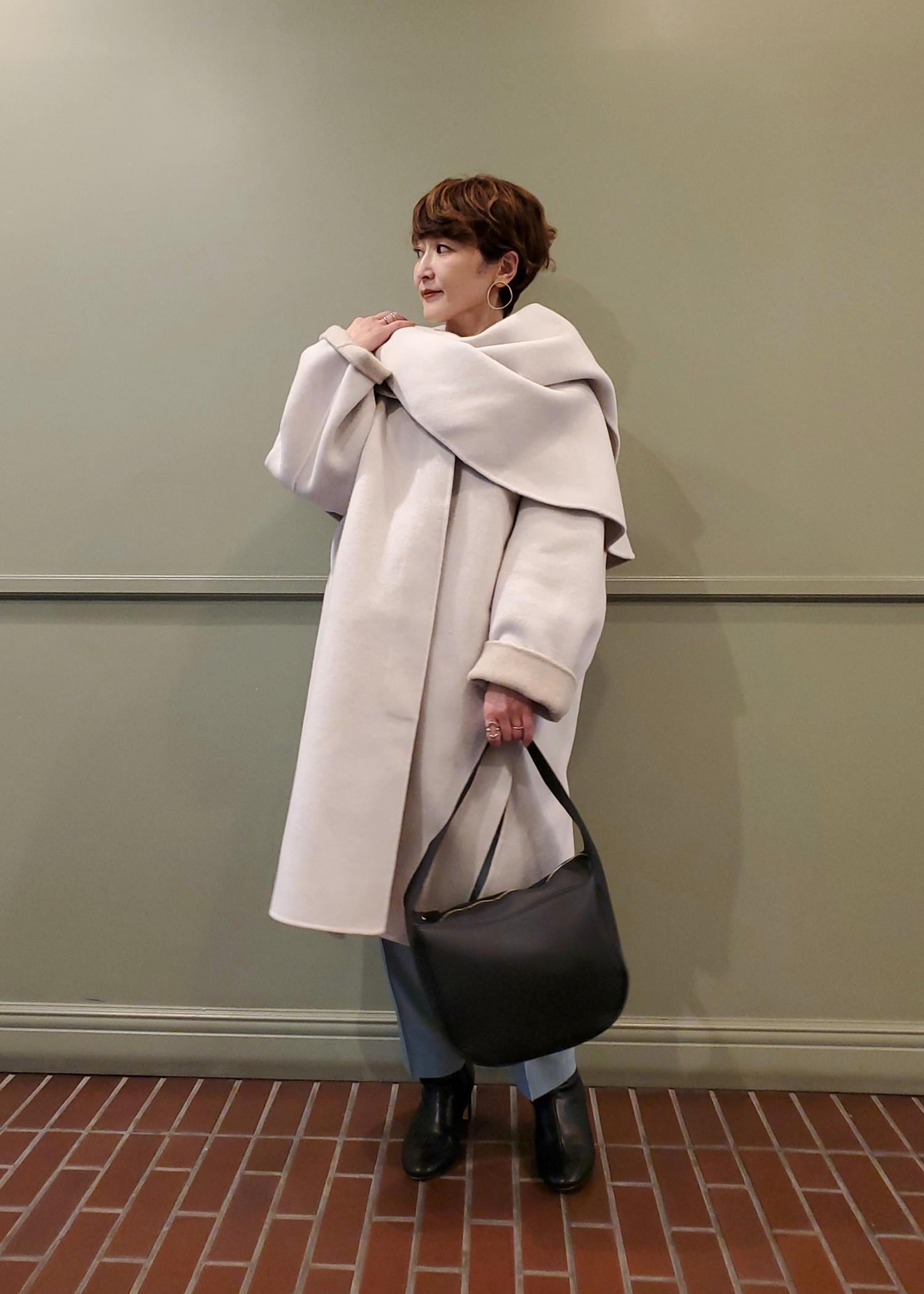 今年らしいボリューミーなショール付きのコート。ワンサイズ展開なものの、着丈がコンパクトで袖の折り返しがしやすく低身長さんでもピッタリ。ボトムにすっきりしたシルエットを合わせて、コートを主役にした冬コーデの完成。
