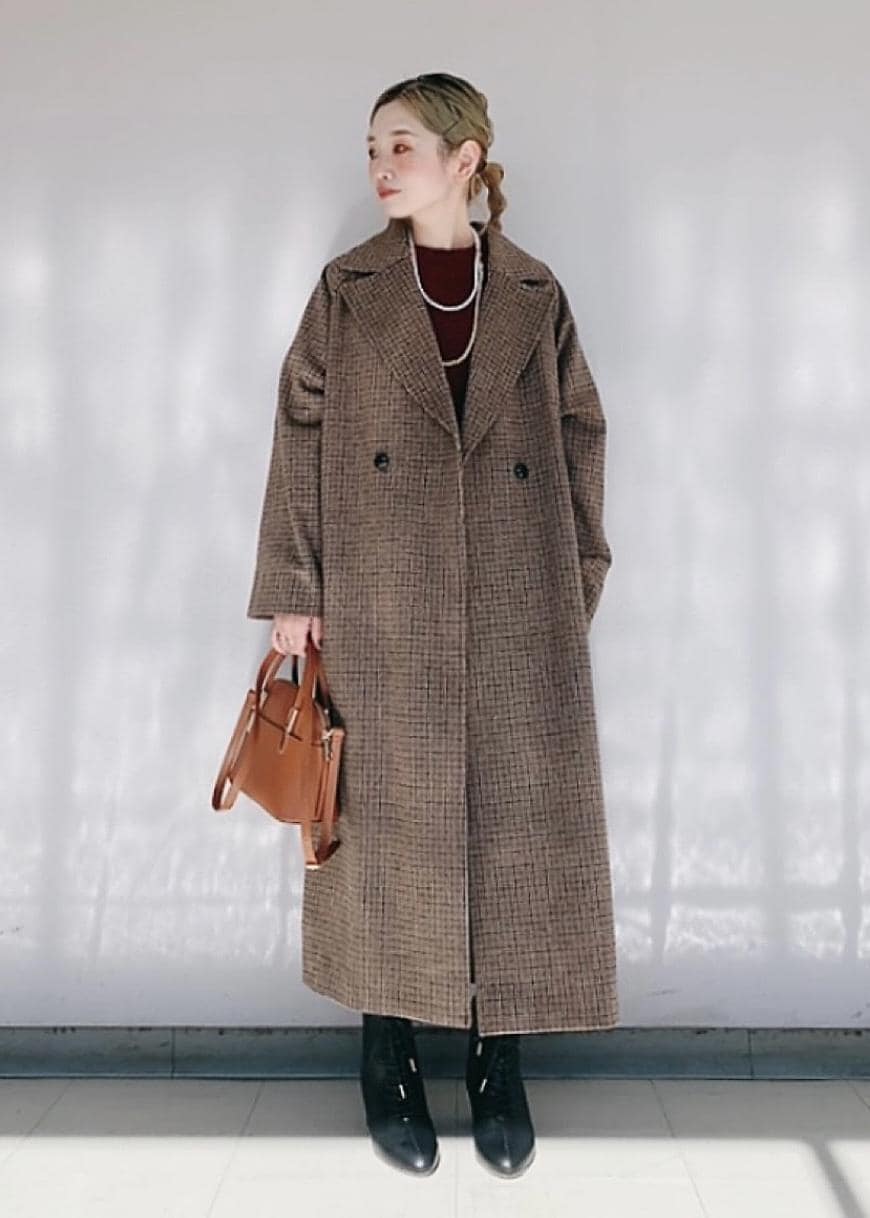 低身長さんはロングコートはどうしても避けがち。あえてオーバーサイズを選ぶことでオシャレなサイズ感が叶います。小柄な方でも大柄なスカートや色味で着せられている感を出さずにバランスを取ることも◎