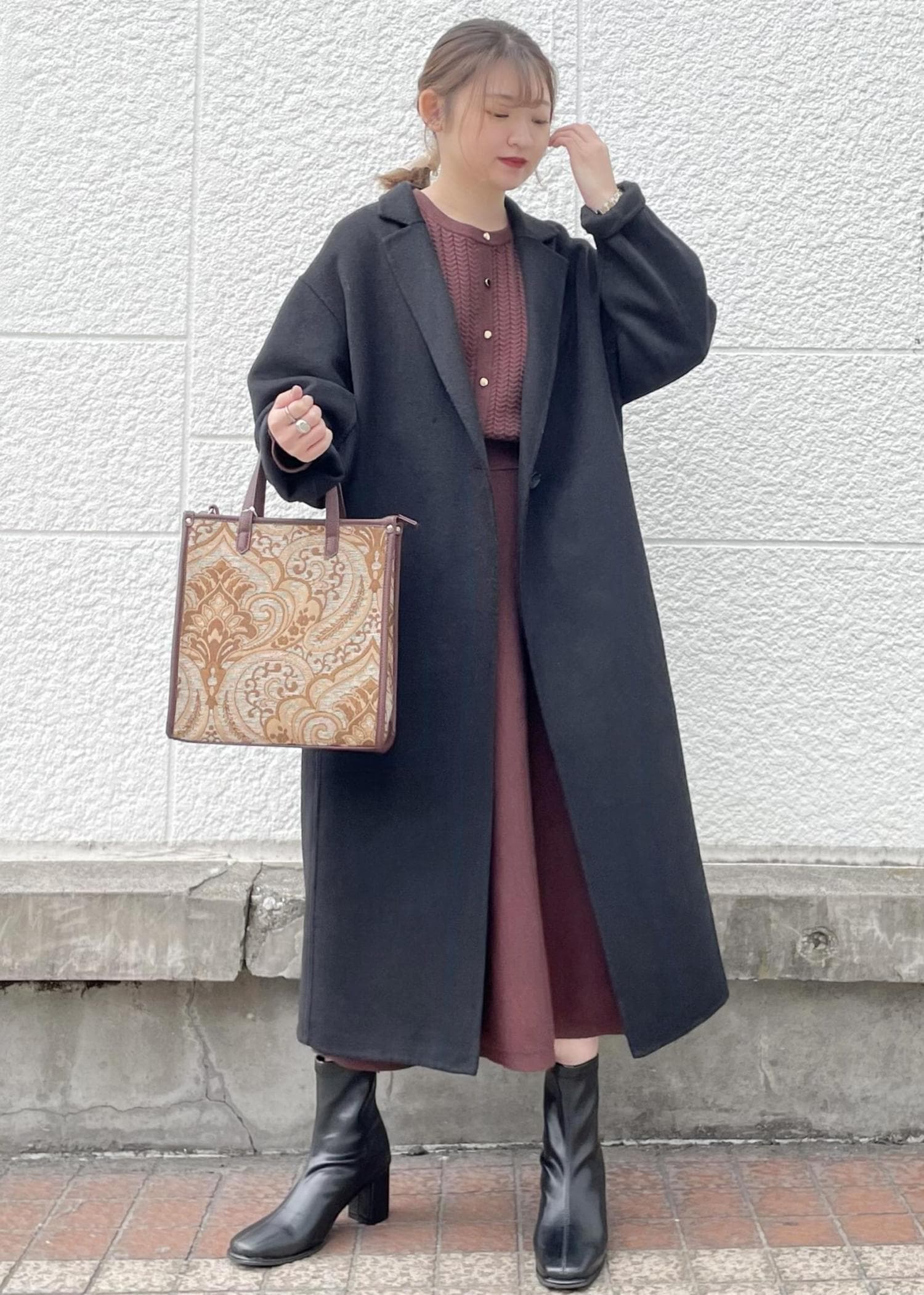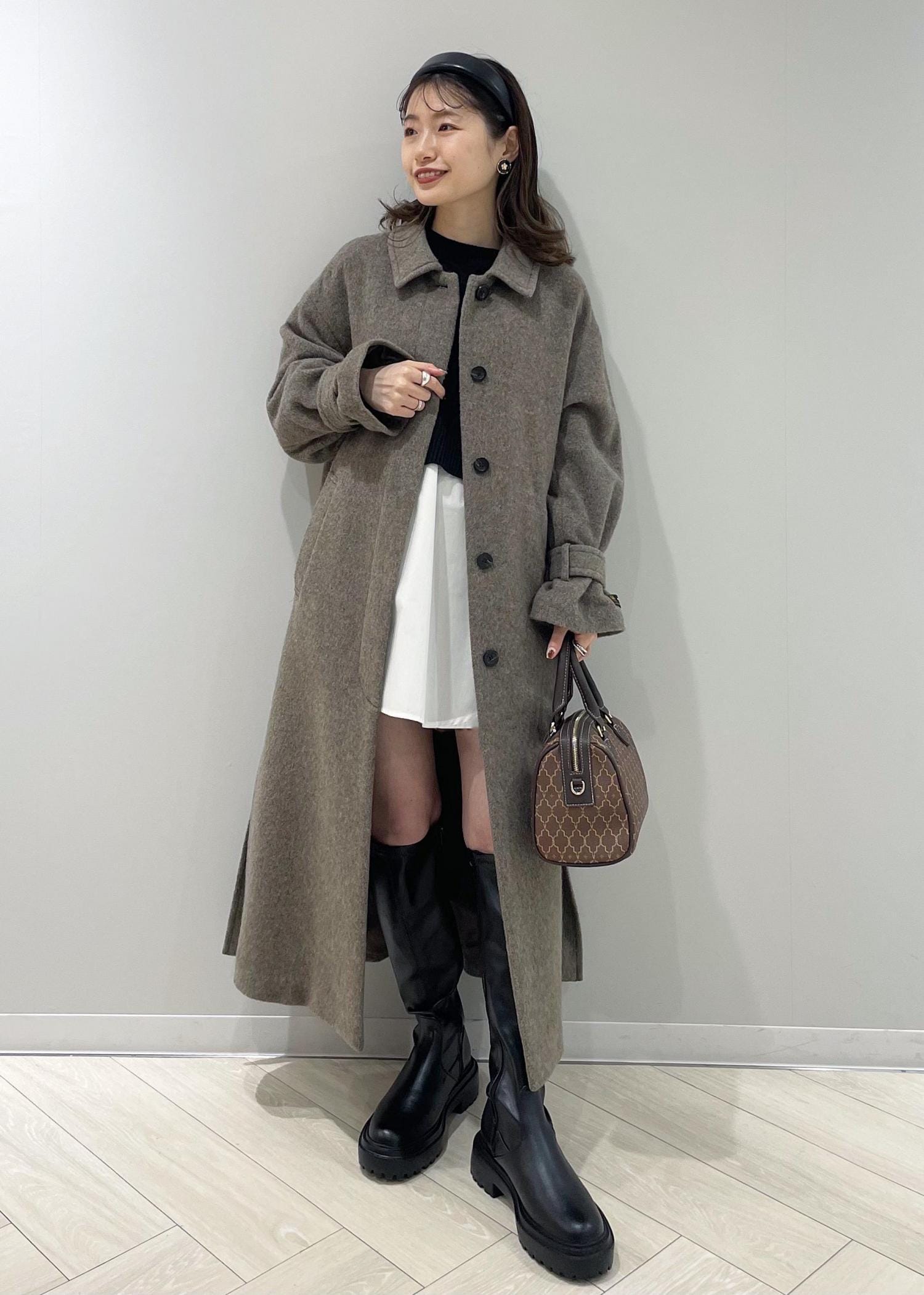 低身長の方も安心丈のSサイズからご用意しているロングコートで淡色コーデ。今年はロングブーツをはいて、ロングコートを羽織るとトレンド感UP。