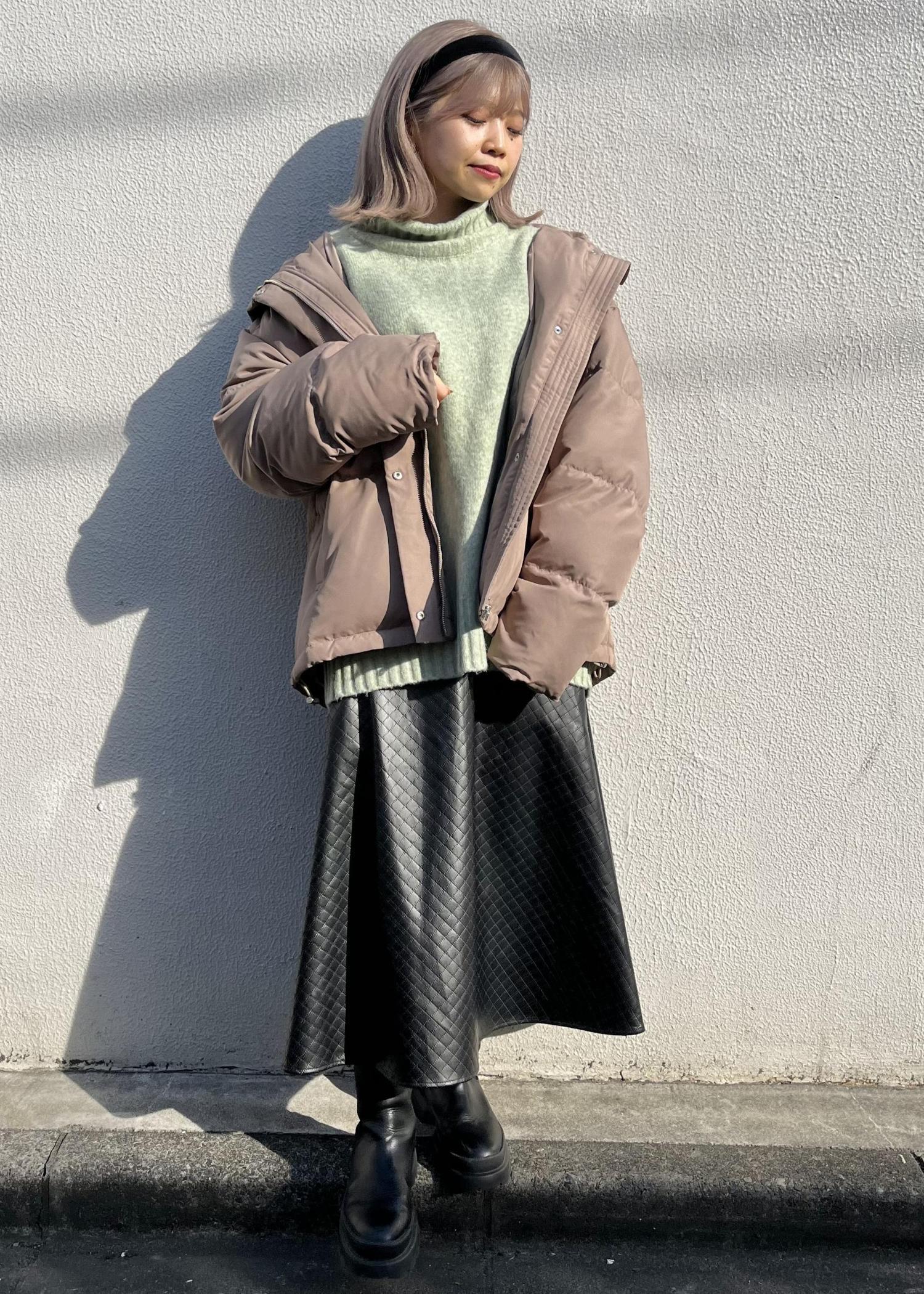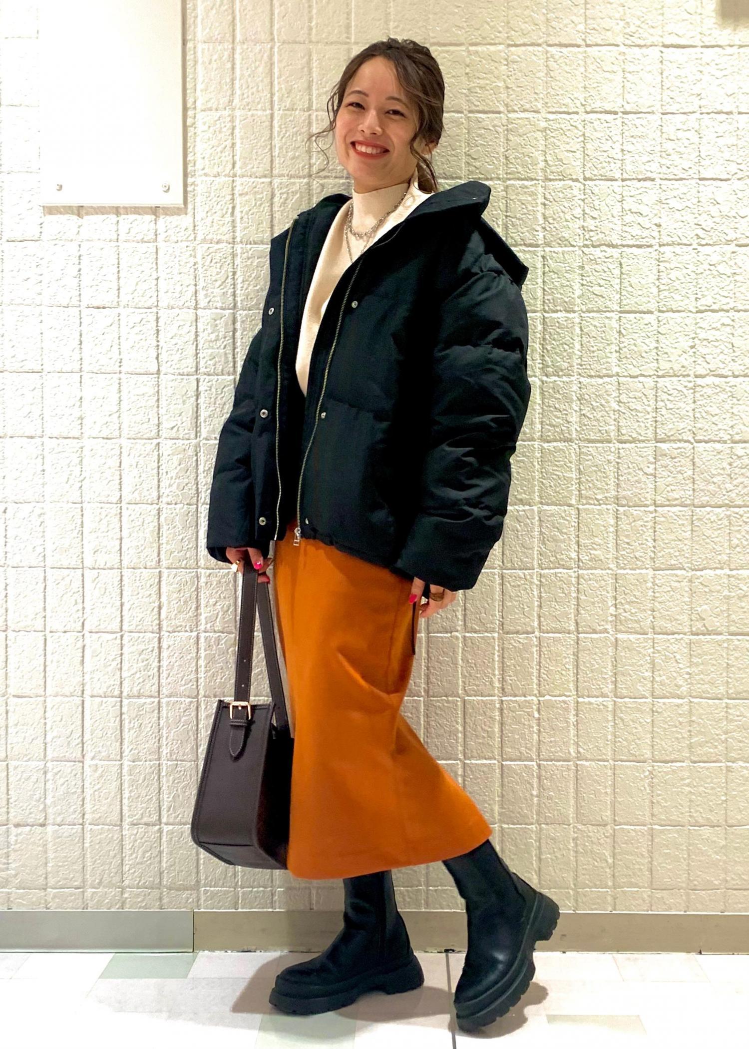 鮮やかなオレンジのタイトスカートは着映えすること間違いなし。ニットとタイトスカートのキレイめなコーデにダウンを合わせ、キレイめカジュアルコーデに。