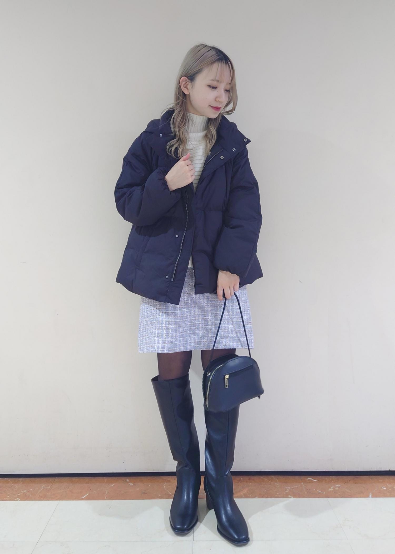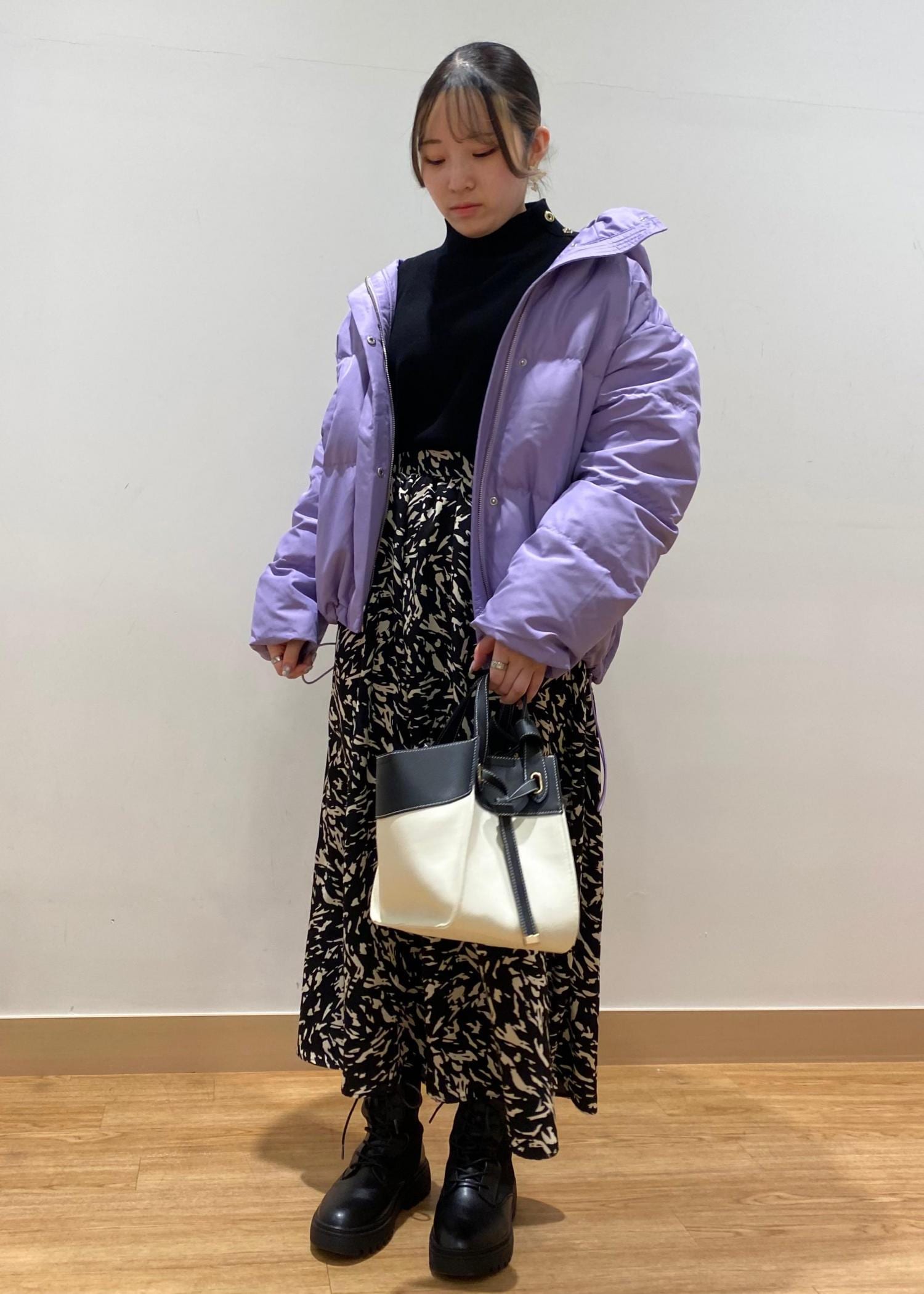 鮮やかなパープルが可愛らしく、パッと目を惹くダウンと黒とゼブラ柄の女性らしいドッキングワンピースを合わせ。足元はレースアップでカジュアルダウン☺︎
