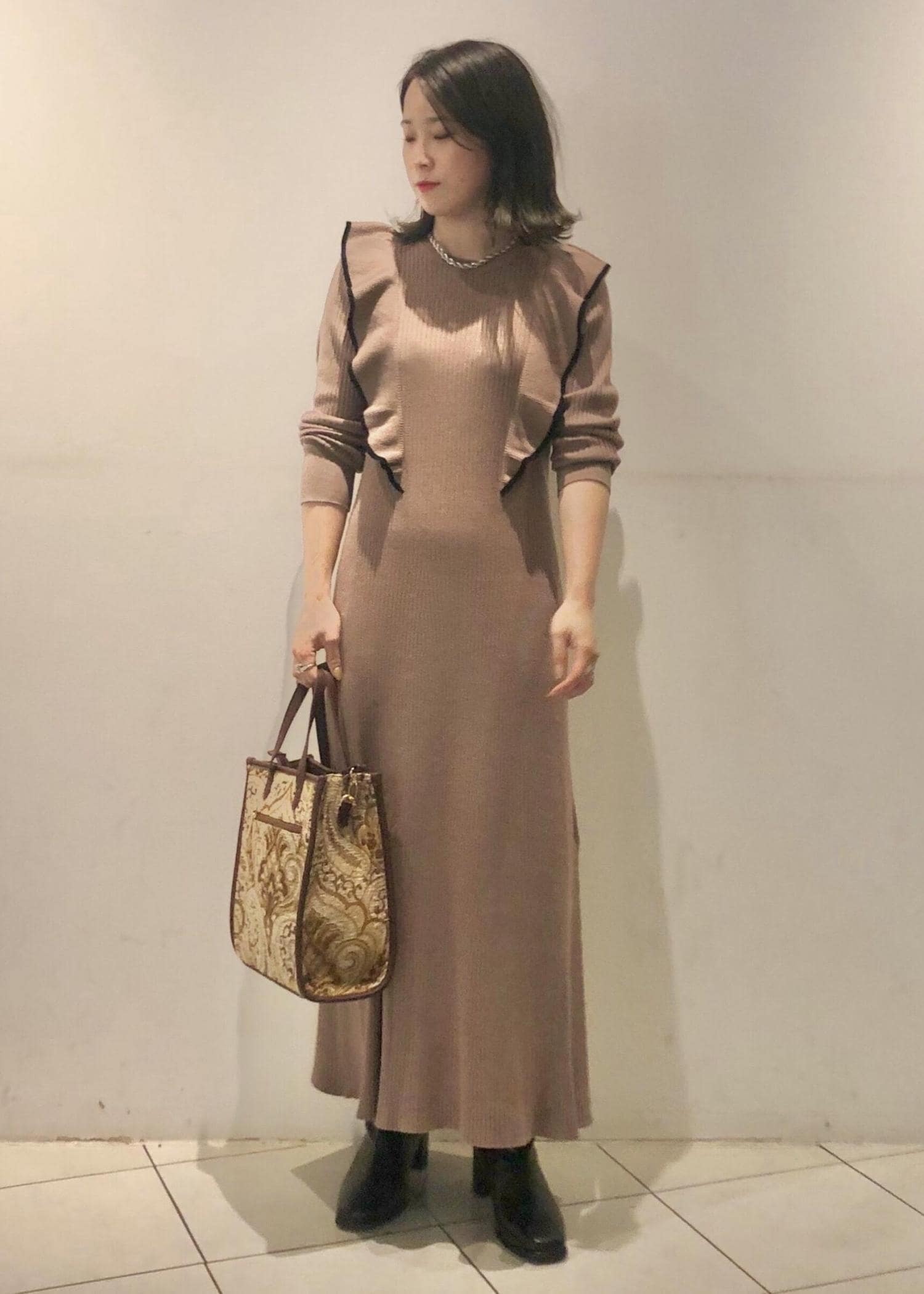 黒とブラウン系のアイテムを使ったシックなコーデ。小物やワンピースにブラウンを入れることで、重たい雰囲気になりすぎない大人な仕上がりに。