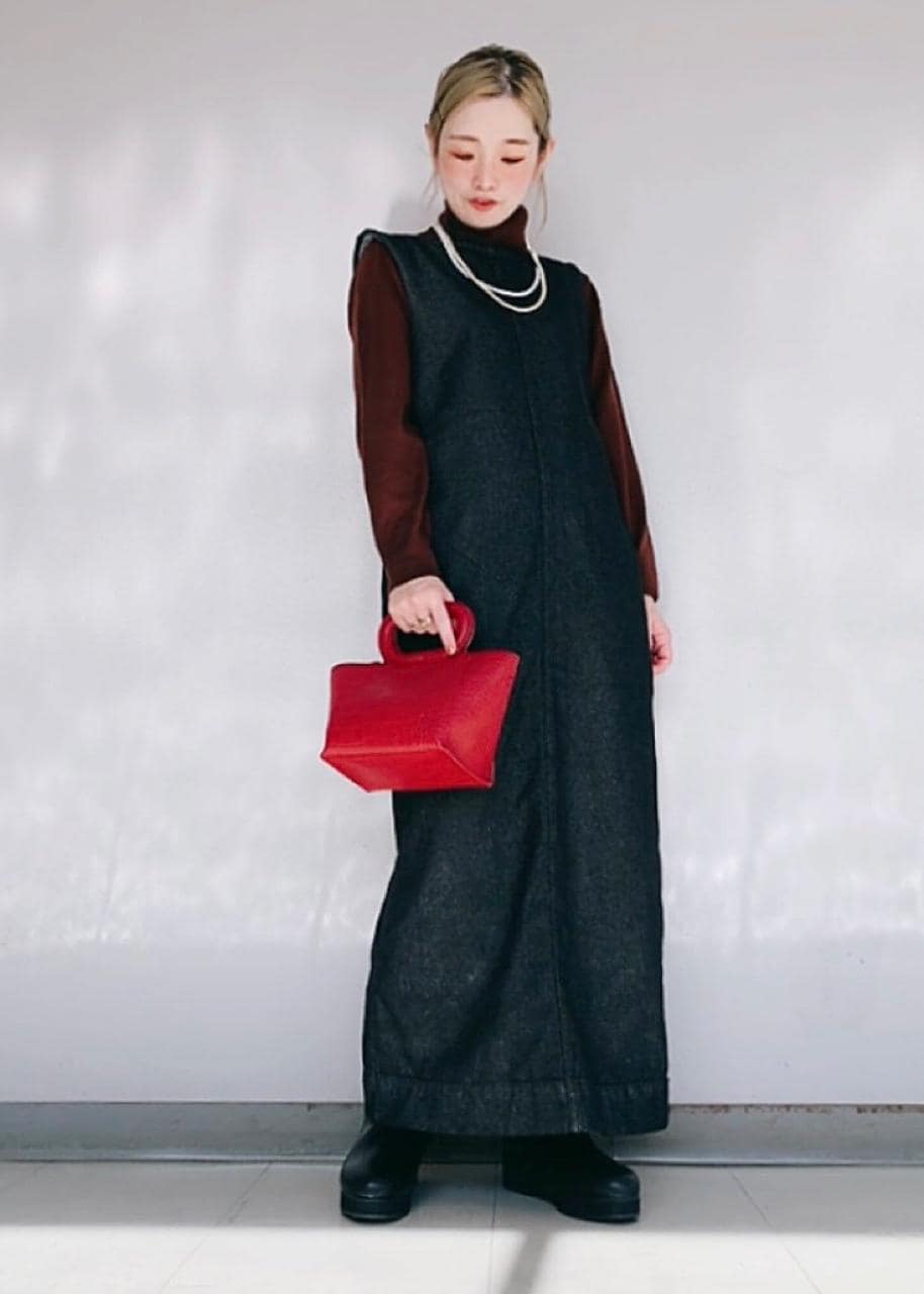 デニムのジャンパースカートのスッキリとしたコーデ。カジュアルになりがちなデニム素材には、細身のインナーやパールネックレスを合わせて、大人っぽく。デートスタイルにもピッタリなコーデです。