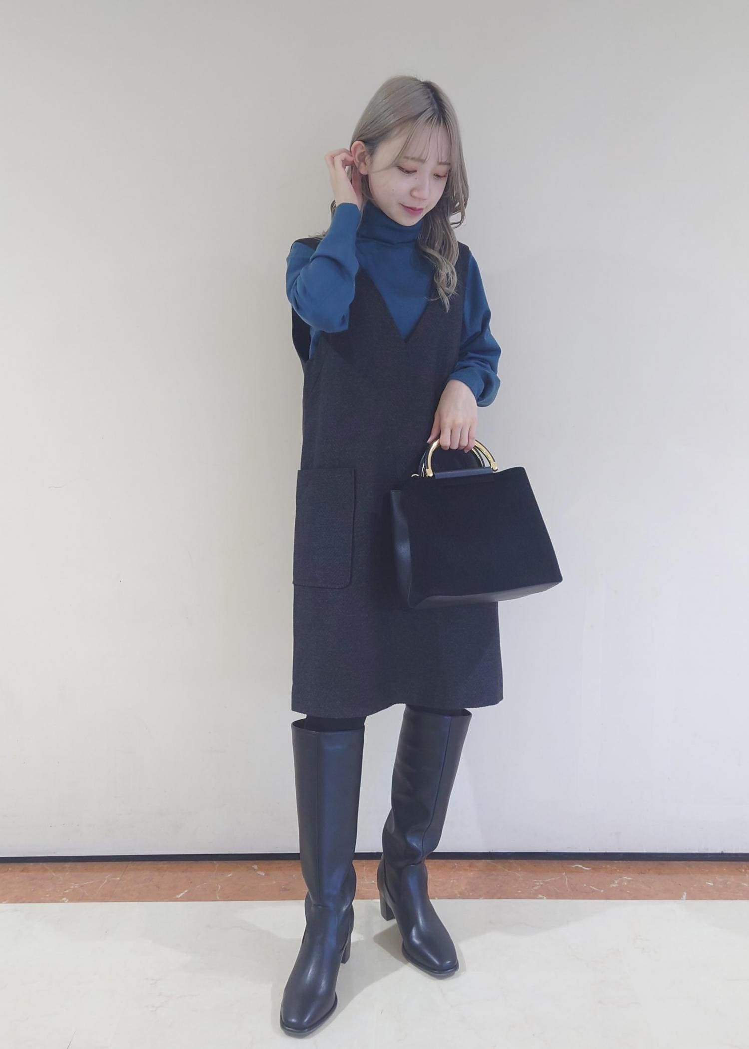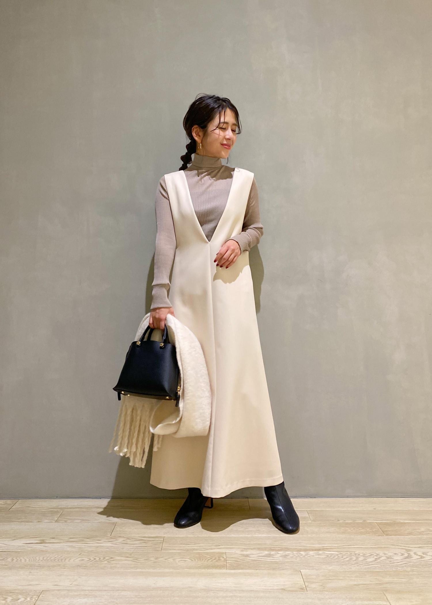 きちんと感と上品さ漂うフレアシルエットのジャンスカに、体のラインをきれいに見せるリブニットを合わせ、可愛らしさもありつつ女性らしいstylingに。