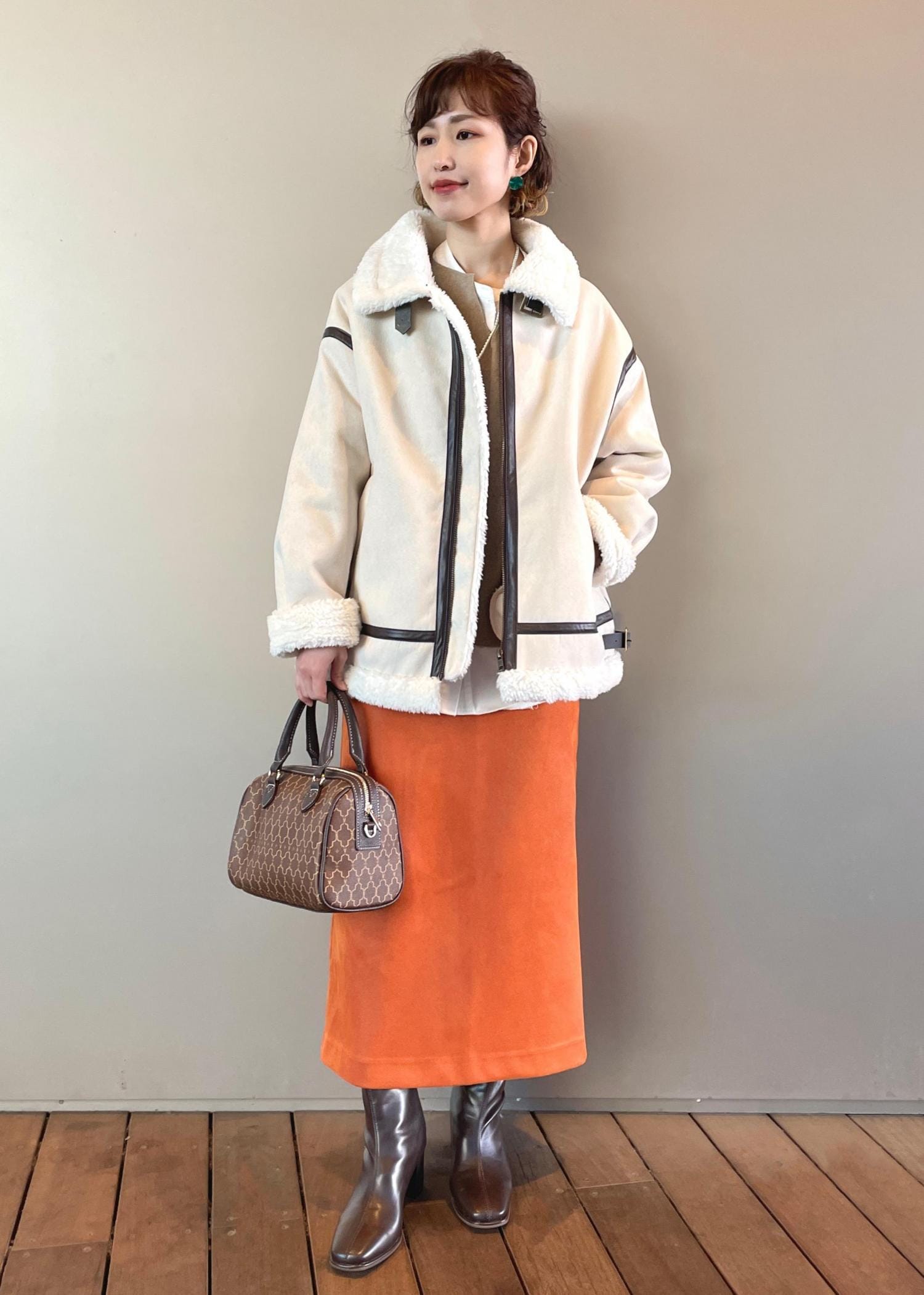 季節を感じるムートンジャケット。ふわふわボリュームが可愛いデザインなので、甘くなりすぎないようオレンジのタイトスカートで大人カジュアルにまとめて。