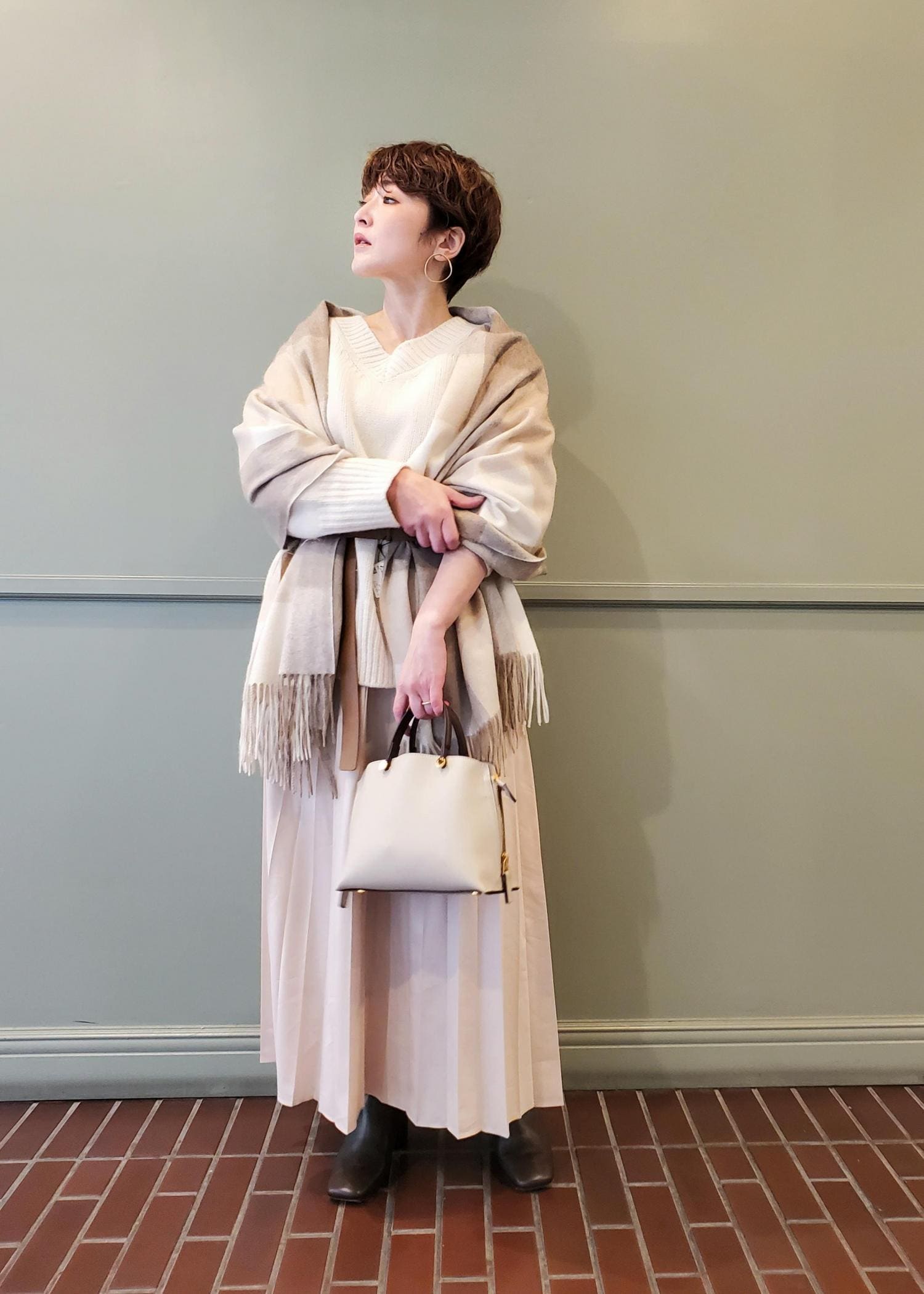 冬にぴったりの淡いグリーンをアクセントに、シンプルな大人フェミニンなコーディネートに。