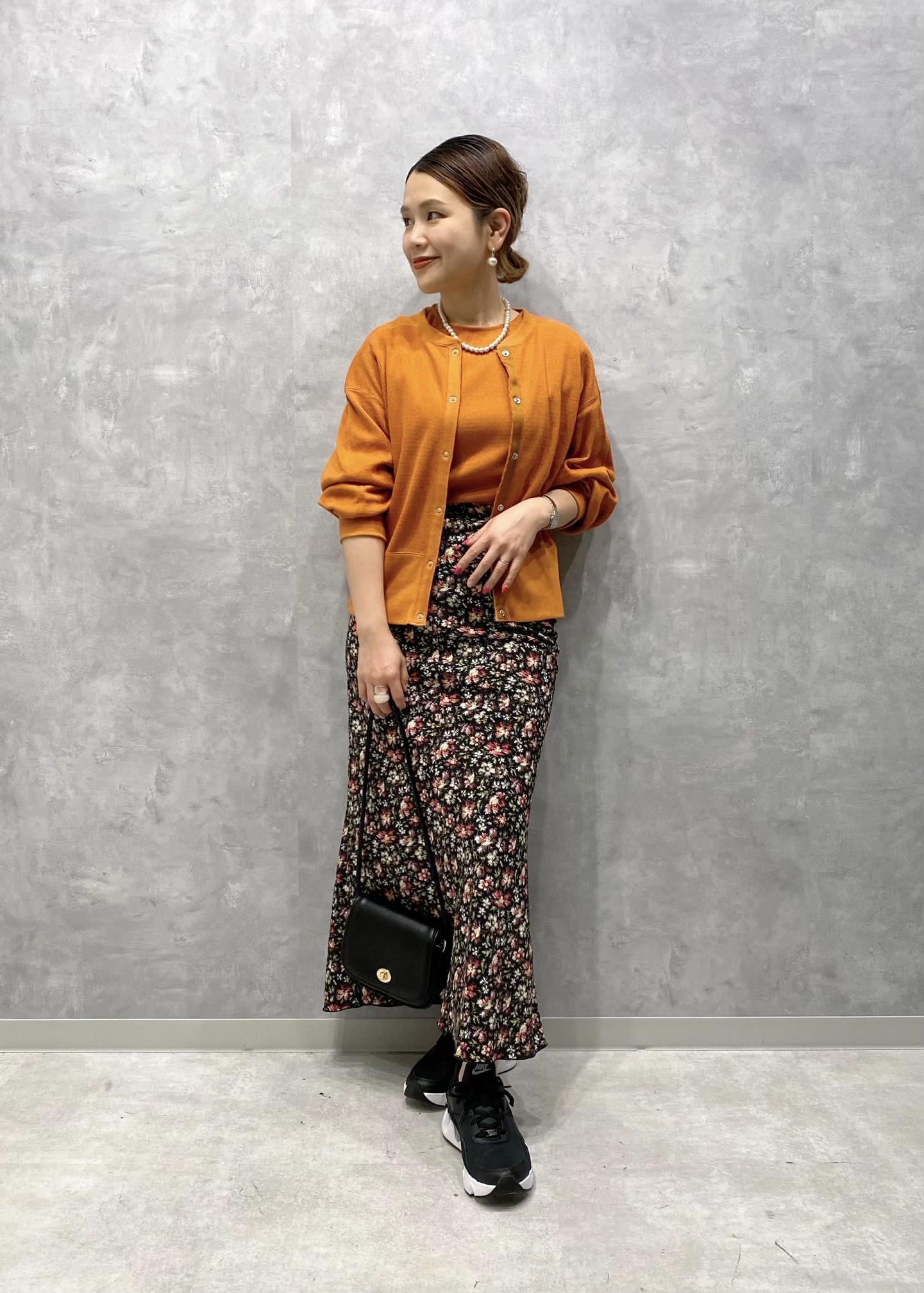 レディライクな花柄のマーメイドスカートに温かみを感じるほんのりくすみがかったオレンジを合わせて、カラーコーデに。足元はあえてスニーカーで合わせてカジュアルMIXに。