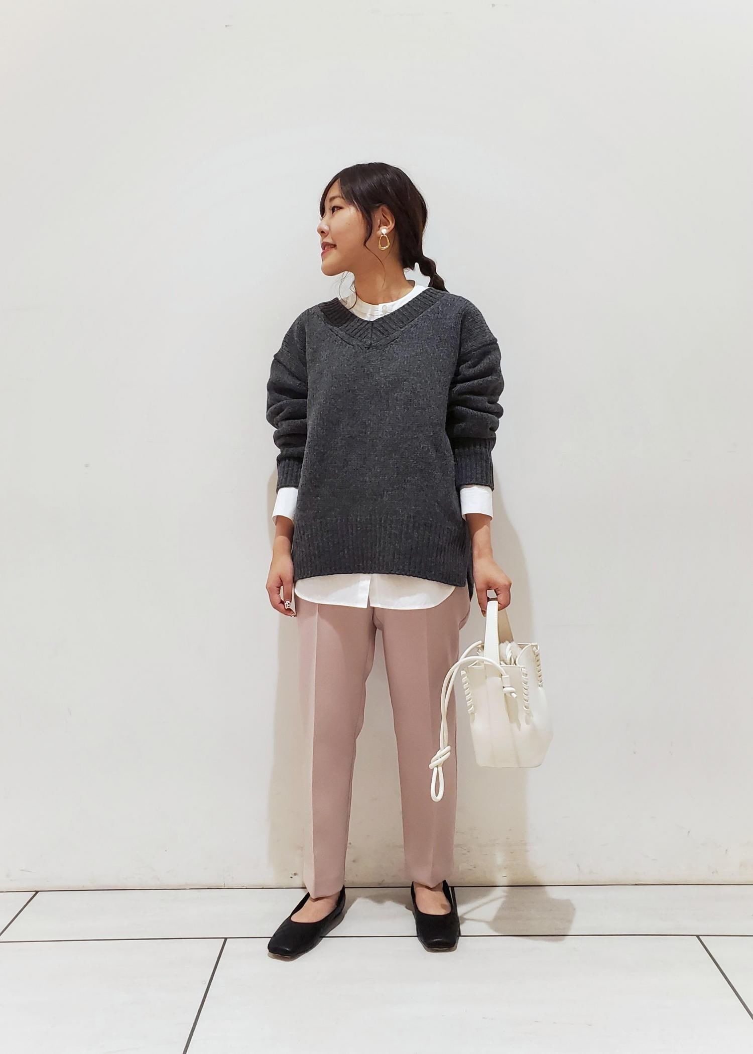 ゆったり目のニットに合わせてリラックス感のあるカジュアルコーデに。ボトムのピンクのカラーが際立つように、トップスのカラーは落ち着いた色をチョイス。